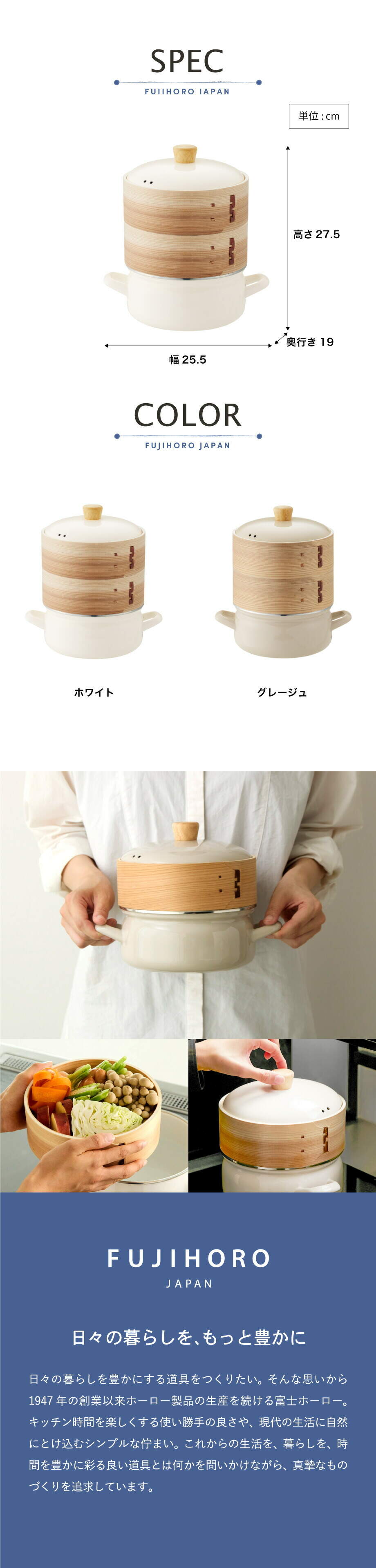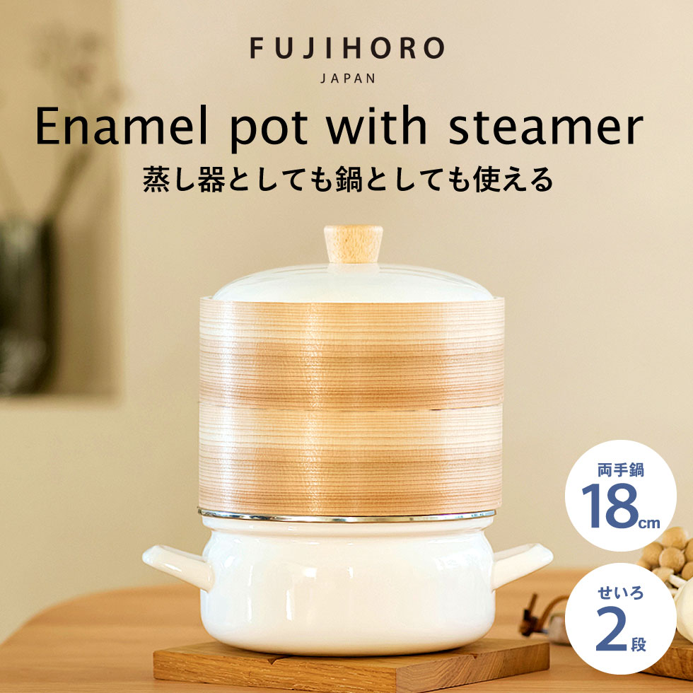 富士ホーロー せいろ付きホーロー鍋 18cm せいろ2段 グレージュ SER-18W SERS-18 / IH対応 ガス火対応 食洗機対応 両手鍋 せいろ蒸し