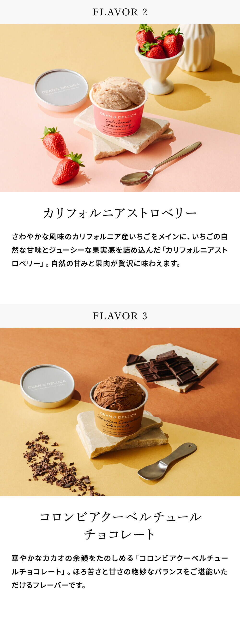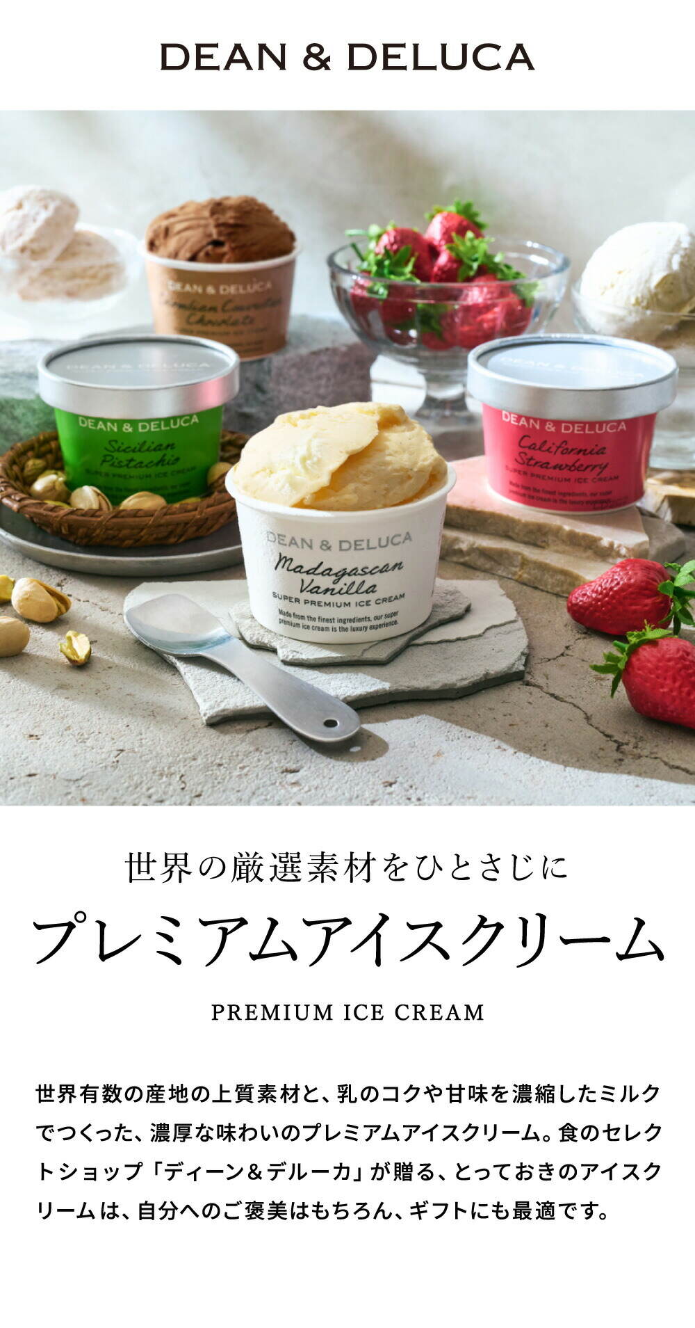 | 原材料/素材/材質 | 【マダガスカルバニラ】脱脂濃縮乳(国内製造)、クリーム、砂糖、卵黄、バニラビーンズ、(一部に乳成分・卵を含む) 【カリフォルニアストロベリー】脱脂濃縮乳(国内製造)、クリーム、砂糖、いちご加工品(いちご、砂糖)、いちごピューレ(いちご、砂糖)、レモン果汁、卵黄、(一部に乳成分・卵を含む) 【シチリアンピスタチオ】脱脂濃縮乳(国内製造)、クリーム、砂糖、ピスタチオペースト、卵黄、(一部に乳成分・卵を含む) 【コロンビアクーベルチュールチョコレート】牛乳(国内製造)、脱脂濃縮乳、クリーム、砂糖、チョコレート、ココア、卵黄/乳化剤、(一部に乳成分・卵を含む) |