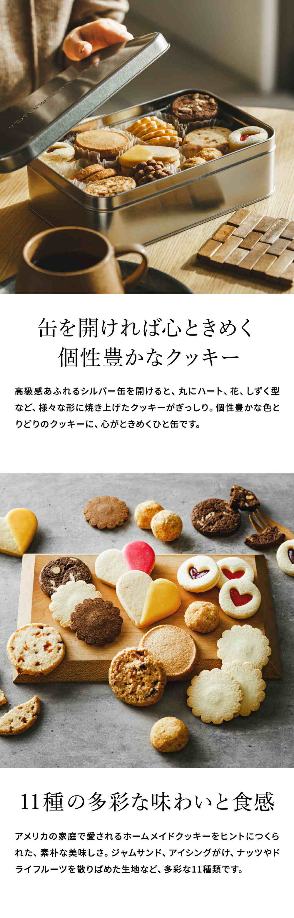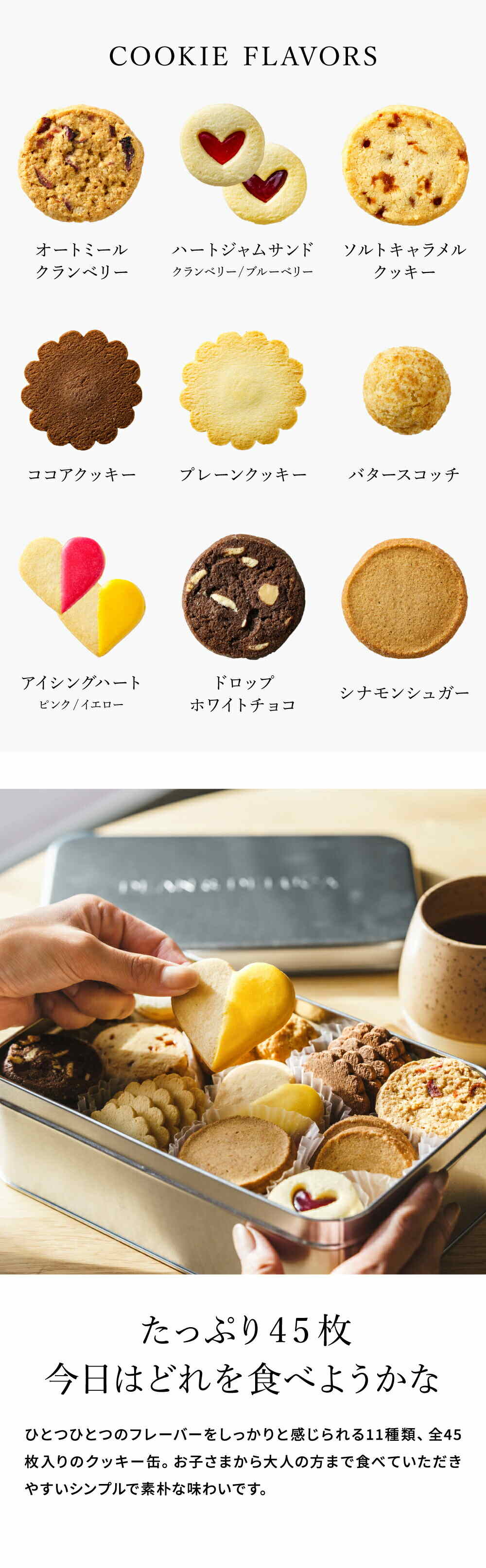 アイシングやジャムサンド、キャラメル、ナッツ、スパイスを使用したクッキーなど、様々な味わいが楽しめるアメリカンクッキーが11種、全部で45枚も入ったクッキー缶。 お子様のいるご家庭の贈りものに、オフィスの差し入れに。