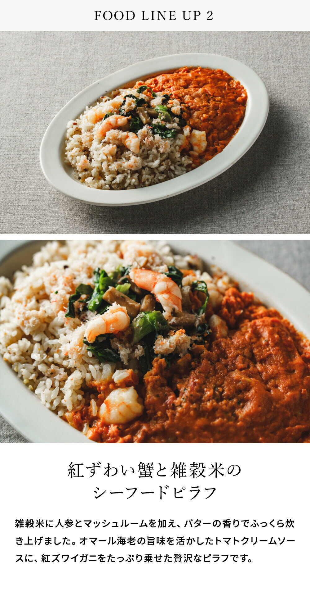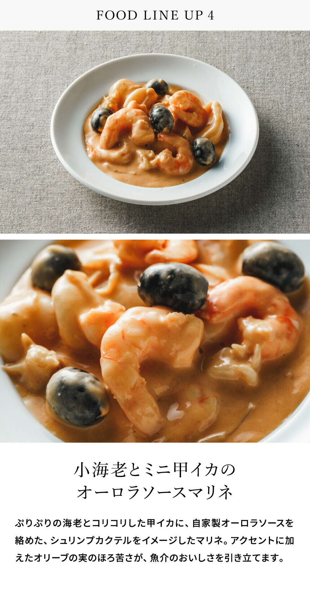 | 内容量 | ・ジャンバラヤ(380g)×1個 ・紅ずわい蟹と雑穀米のシーフードピラフ(385g)×1個 ・アマトリチャーナのペンネ(280g)×1個 ・小海老とミニ甲イカのオーロラソースマリネ(150g)×1個 ・ラタトゥイユ(150g)×1個 |