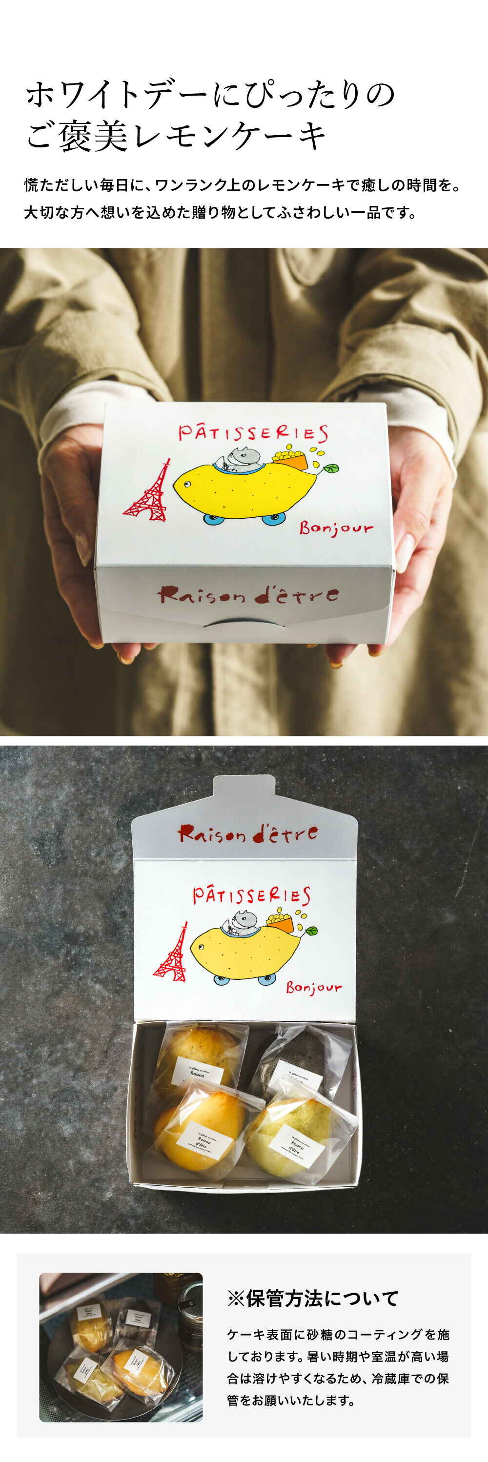 | 内容量 | レモンケーキ×4(プレーン、アールグレイ、カカオ、抹茶×各1) |