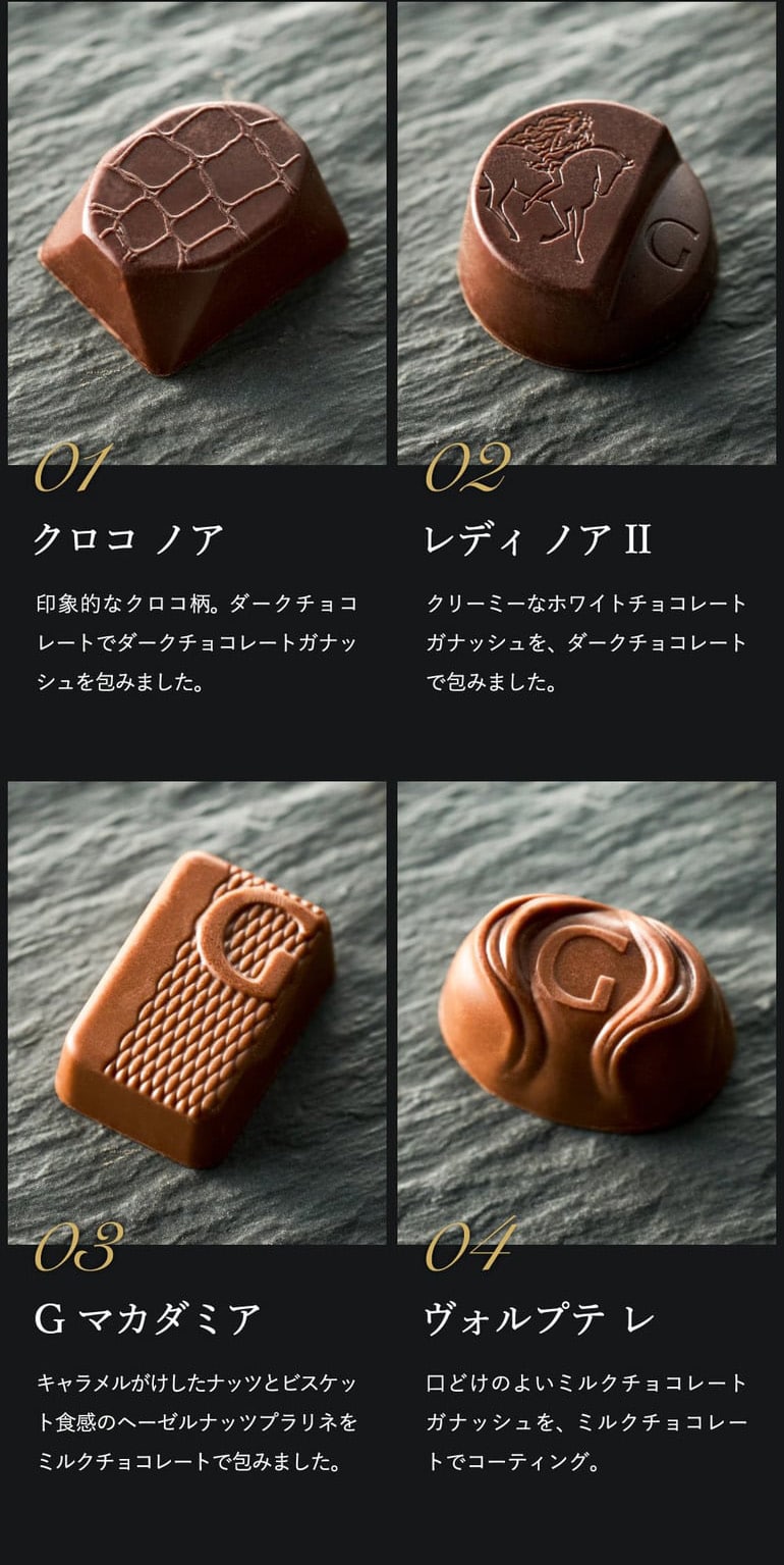 | 原材料/素材/材質 | チョコレート:砂糖、カカオマス、全粉乳、ココアバター、バターオイル、加糖練乳、バター、異性化液糖、転化糖、ヘーゼルナッツ、乳等を主要原料とする食品、植物油脂、マカダミアナッツ、小麦粉、ココアパウダー、脱脂粉乳、食塩、はちみつ、バニラパウダー、アーモンド、ピーカンナッツ、米粉、クリーム/ソルビトール、乳化剤、香料、グリセリン、(一部に小麦・乳成分・アーモンド・大豆・マカダミアナッツを含む) 焼菓子:<ミルクチョコレート> チョコレート(ベルギー製造)、小麦粉、卵白、粉糖、ショートニング、バター、砂糖、加糖練乳、ココアパウダー、食塩、レモン濃縮果汁/香料、乳化剤、(一部に小麦・卵・乳成分・大豆を含む) <ダークチョコレート> チョコレート(ベルギー製造)、卵白、小麦粉、粉糖、ショートニング、バター、砂糖、加糖練乳、ココアパウダー、食塩/香料、乳化剤、(一部に小麦・卵・乳成分・大豆を含む) |