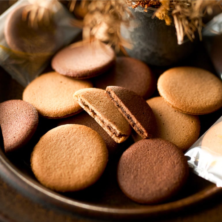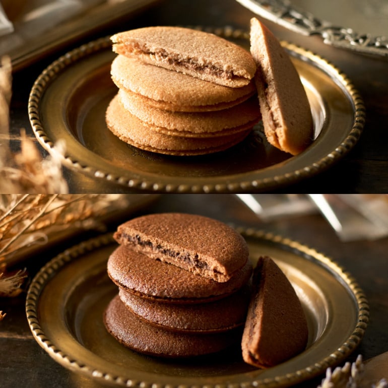 サクっと軽やかな2種のラングドシャ生地に、異なる味わいのチョコレートの組み合わせ。なめらかな口どけと濃厚なチョコレートの風味が広がるラングドシャです。