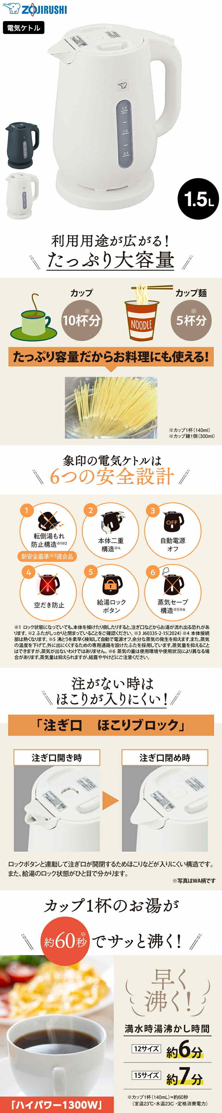 象印 電気ケトル 1.5L ホワイト CK-VB15 / 転倒お湯もれ防止 二重構造 蒸気レス ほこりブロック 空だき防止 電気ポット