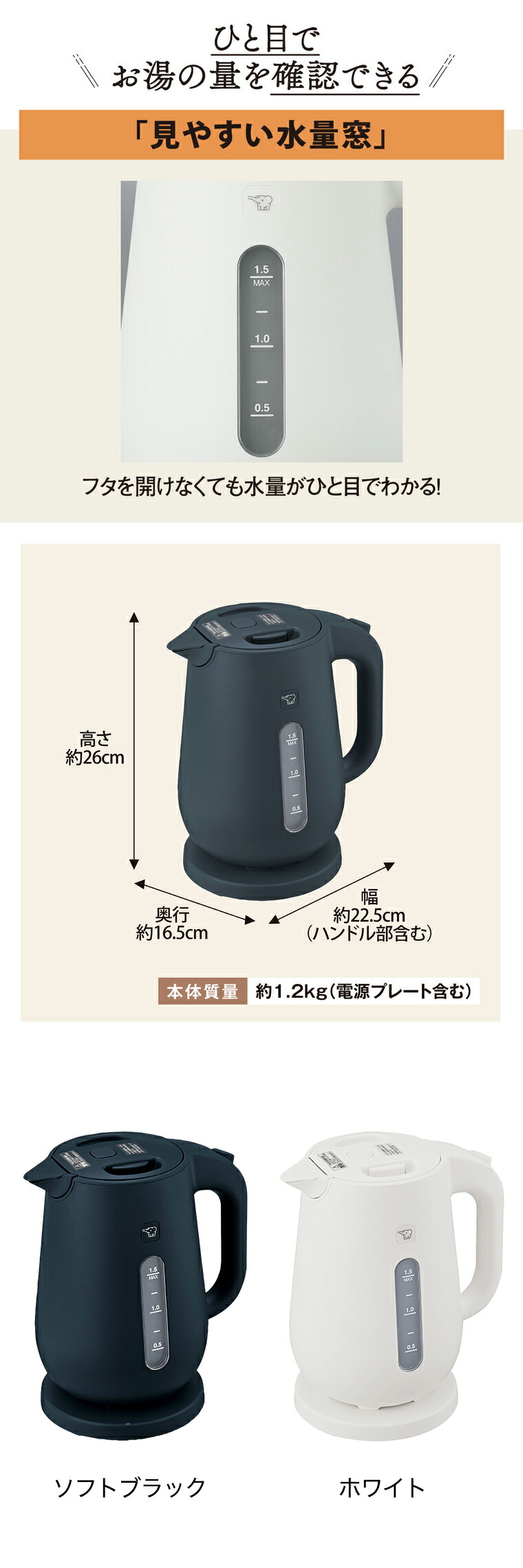 | その他詳細 1 | 容量:1.5L 消費電力:湯沸かし時 1300W 保証期間:ご購入から本体1年間 箱サイズ:約 幅23×奥行21×高さ26.6cm |