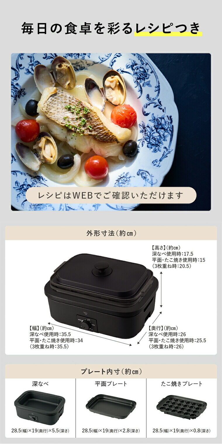 | サイズ/寸法 | 本体サイズ: 3枚重ね時:約 幅35.5×奥行26.0×高さ20.5cm 深なべ使用時:約 幅35.5×奥行26×高さ17.5cm 平面プレート・たこ焼きプレート使用時:約 幅34×奥行25.5×高さ15cm プレート内寸 深なべ:約 幅28.5×奥行19×高さ5.5cm 平面プレート:約 幅28.5×奥行19×高さ2.8cm たこ焼きプレート:約 幅28.5×奥行19×高さ0.8cm |