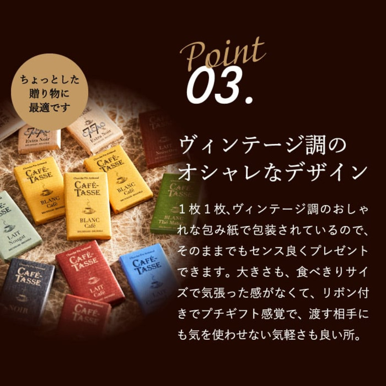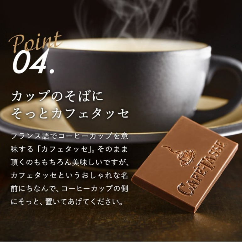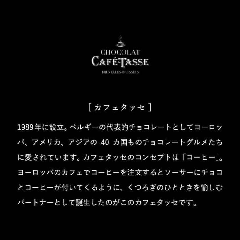チョコレートの本場・ベルギー生まれの「カフェタッセ」。フランス語で「コーヒーカップ」を意味するこのチョコレートは、コーヒーとの相性を追求したチョコレートです。板チョコを小さくしたような12種のチョコレート。濃厚な大人の味わいのカカオ 77%やコーヒー豆のクランチが入ったコーヒーホワイトなどカフェタッセブランドの味をコーヒーと一緒にお楽しみください。
