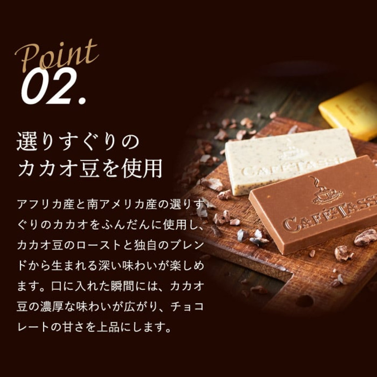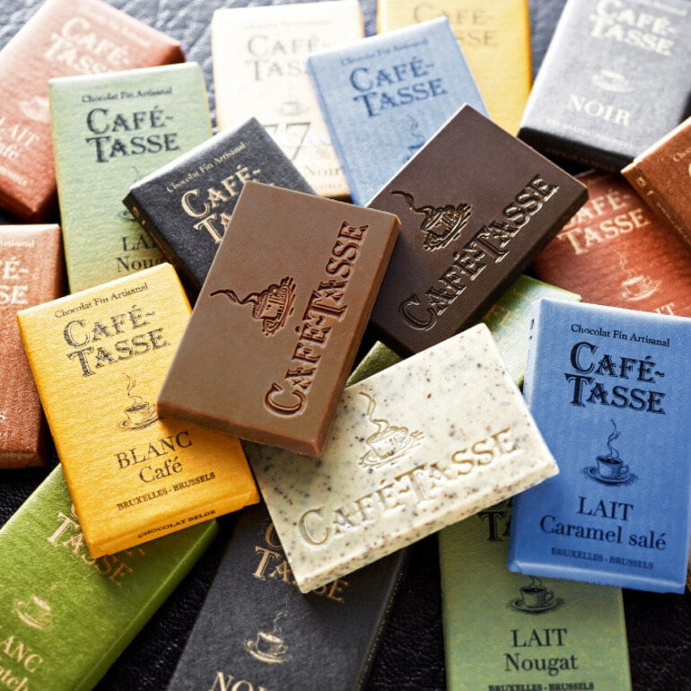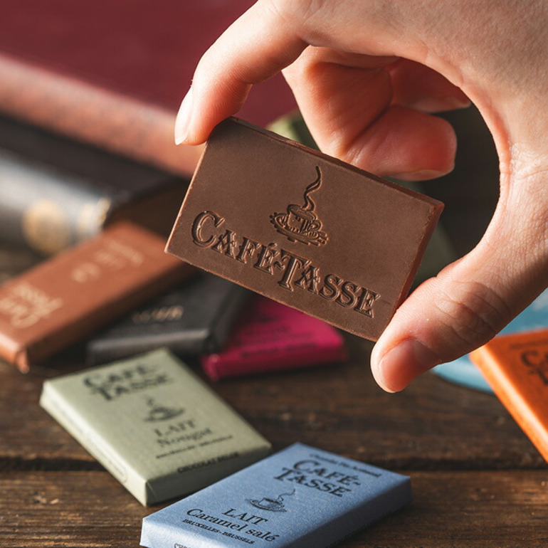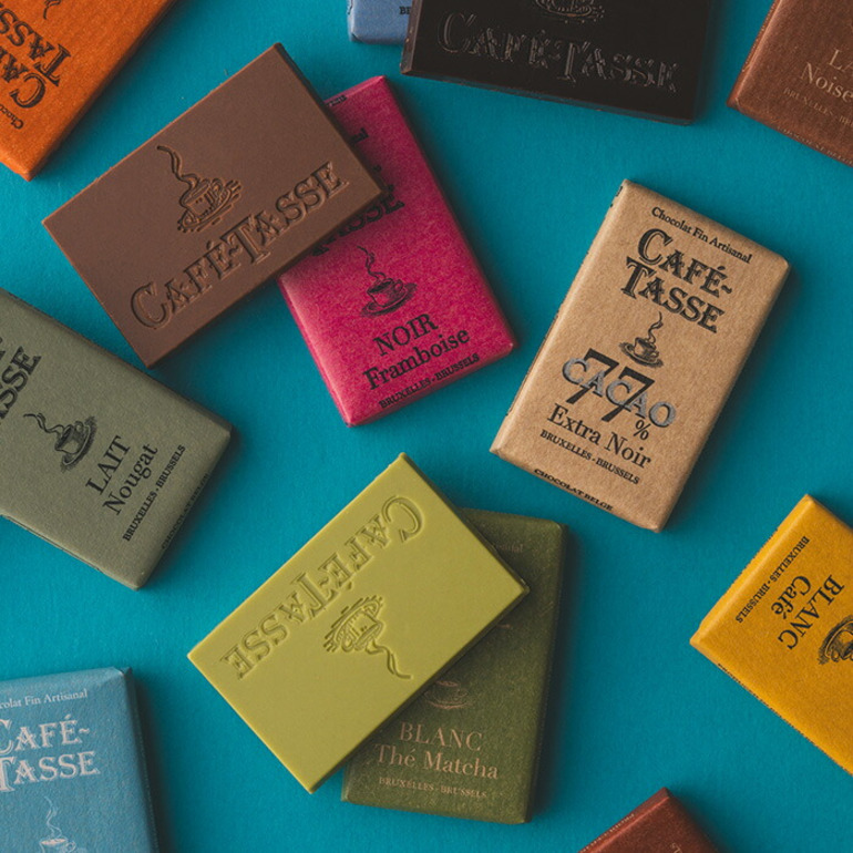 チョコレートの本場・ベルギー生まれの「カフェタッセ」。フランス語で「コーヒーカップ」を意味するこのチョコレートは、コーヒーとの相性を追求したチョコレートです。板チョコを小さくしたような12種のチョコレート。濃厚な大人の味わいのカカオ 77%やコーヒー豆のクランチが入ったコーヒーホワイトなどカフェタッセブランドの味をコーヒーと一緒にお楽しみください。