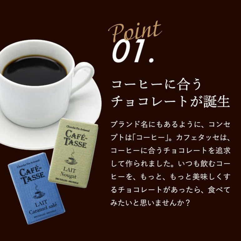 ブランド名にもあるように、コンセプトは「コーヒー」。カフェタッセは、コーヒーに合うチョコレートを追求して作られました。いつも飲むコーヒーを、もっと、もっと美味しくするチョコレートがあったら、食べてみたいと思いませんか?