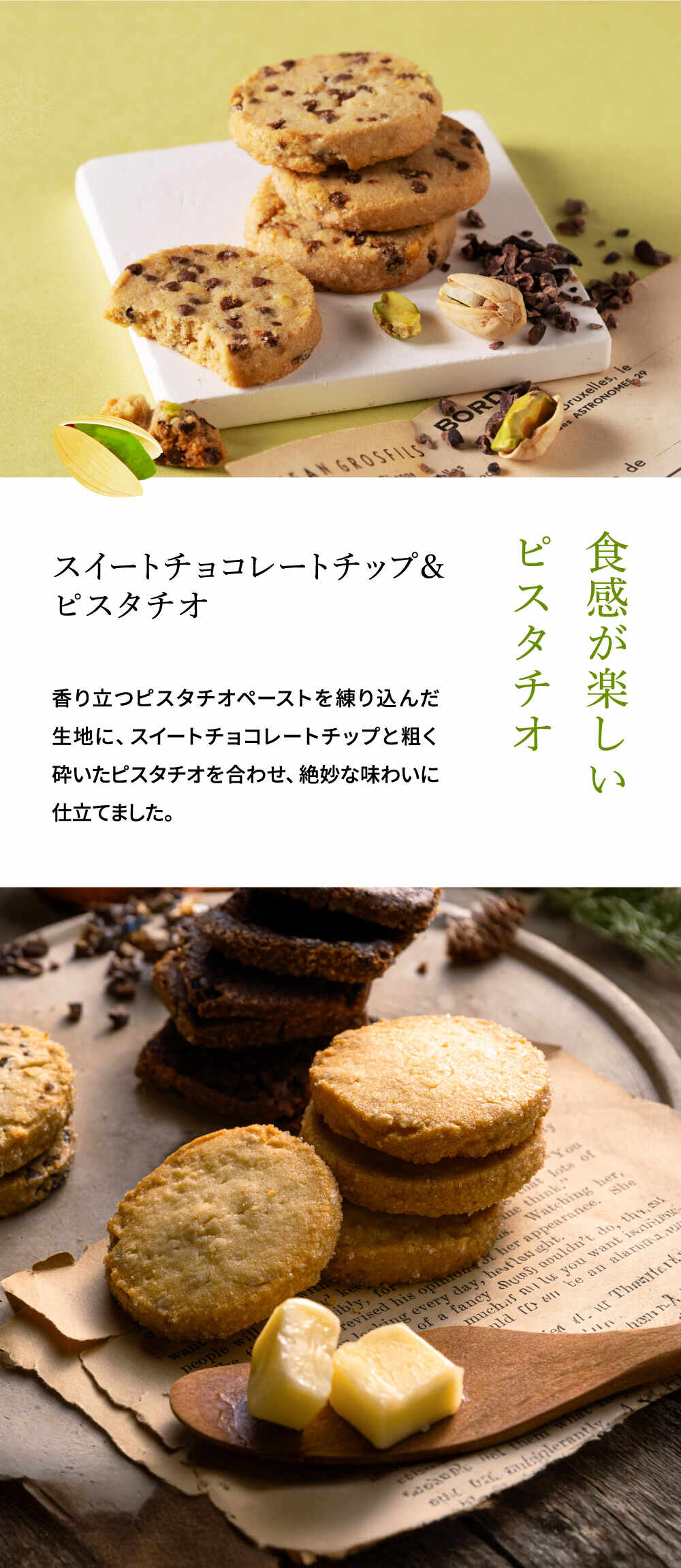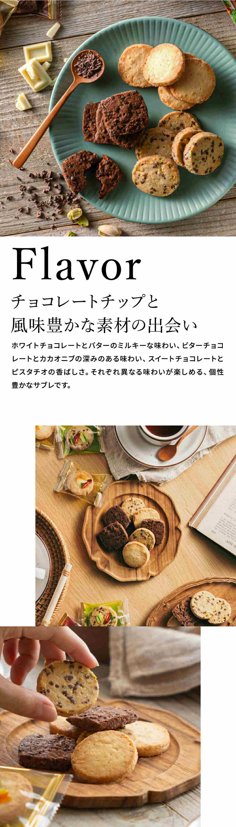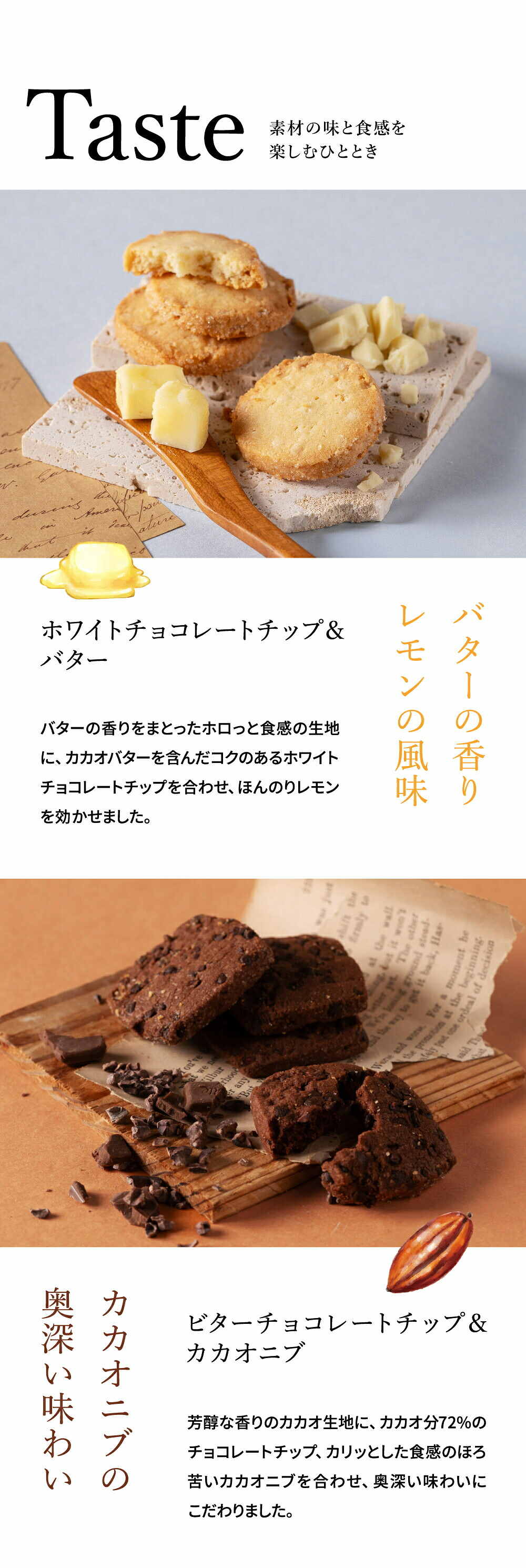 | 内容量 | ビターチョコレートチップ&カカオニブ×20枚、スイートチョコレートチップ&ピスタチオ×11枚、ホワイトチョコレートチップ&バター×11枚 |