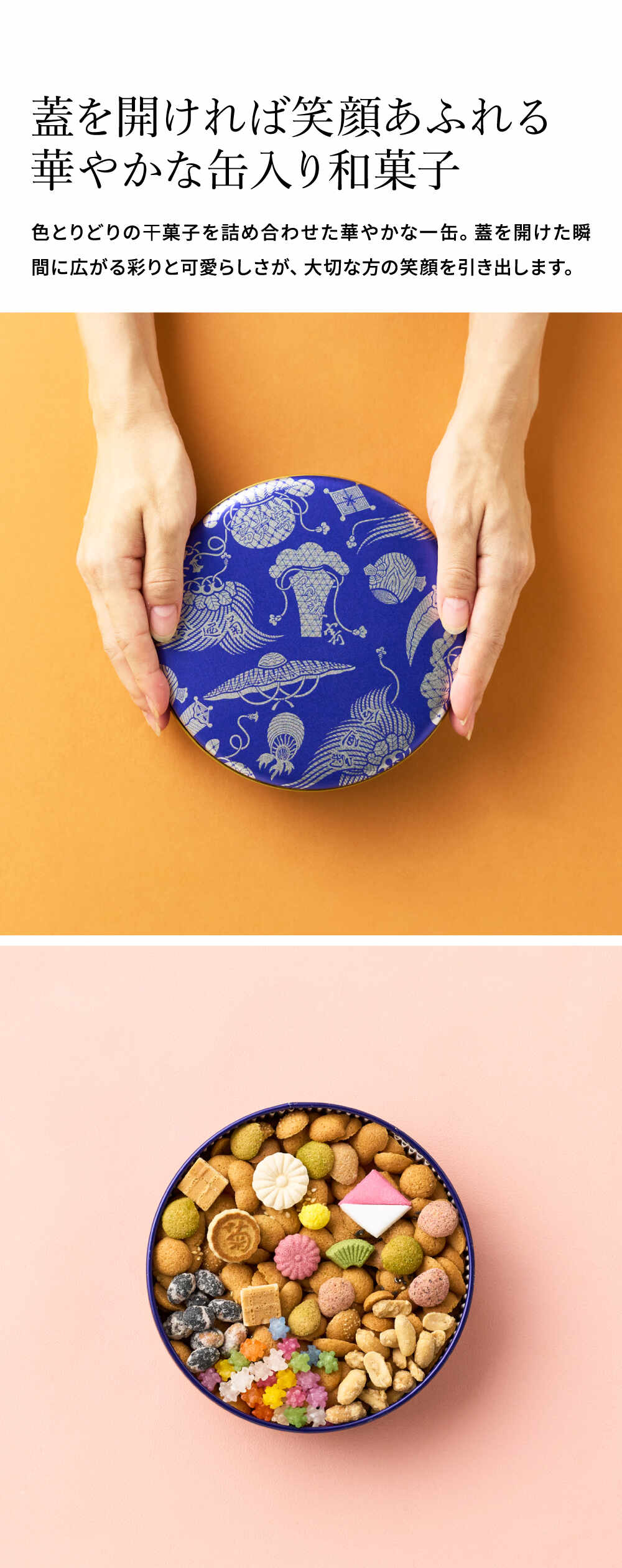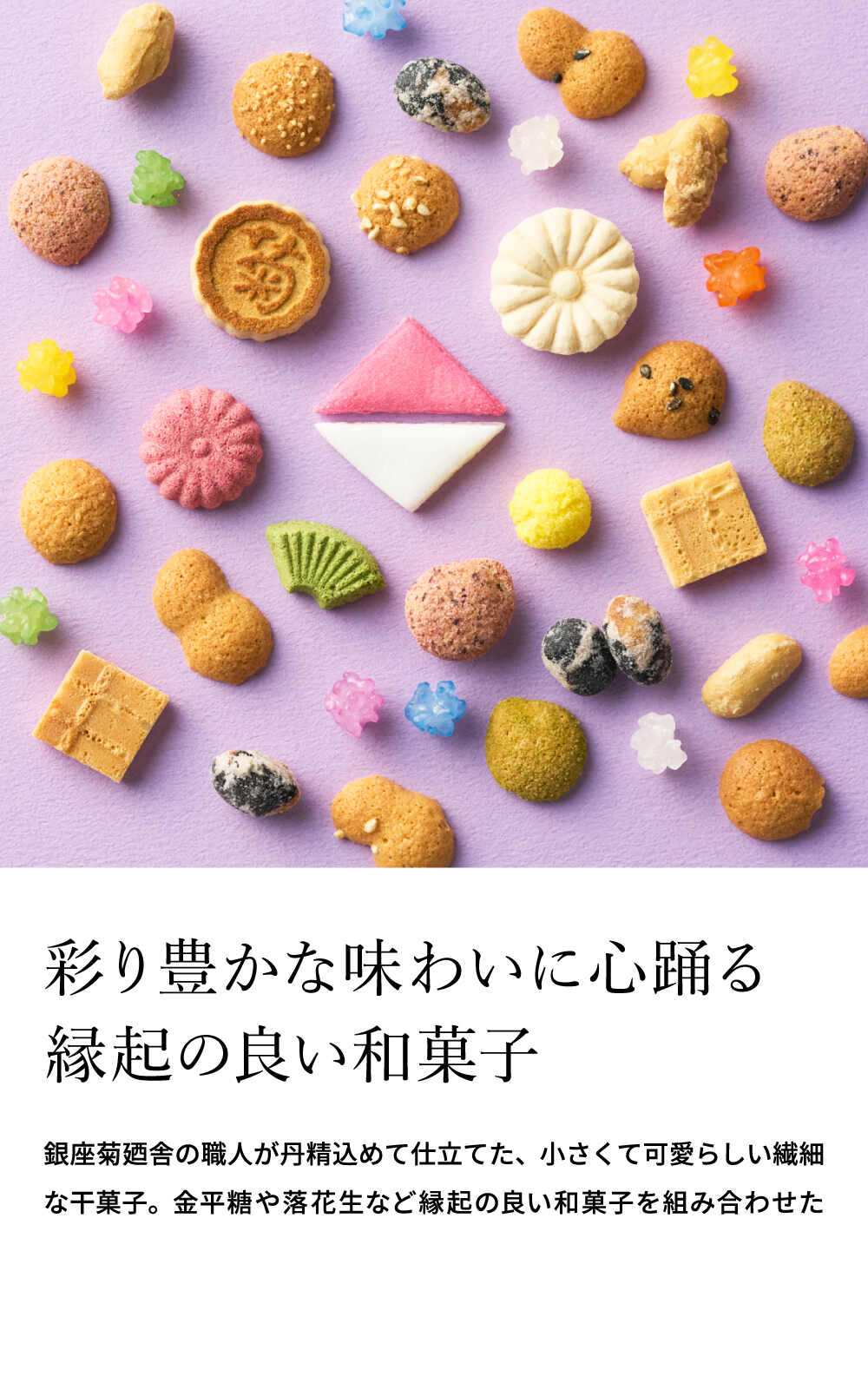 | 原材料/素材/材質 | 小麦粉(小麦(北海道産))、砂糖、鶏卵、和三盆糖、落花生、大豆、ごま、黒糖、抹茶、しそ粉(しそ、食塩、梅酢)、生姜粉末、ココナッツ、けしの実、ココア、青海苔、豌豆粉、餅米粉、澱粉、水飴、食用精製加工油脂、食用植物油脂、食塩/着色料(ビートレッド、クチナシ色素、ベニバナ色素、パプリカ色素、カラメル色素、ベニコウジ色素)、香料、酸味料、乳化剤 |