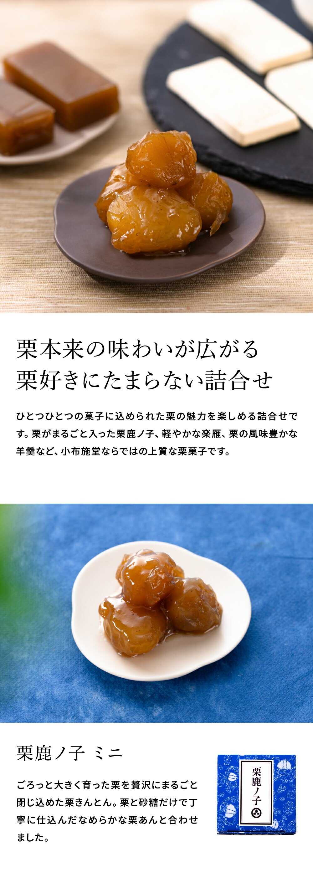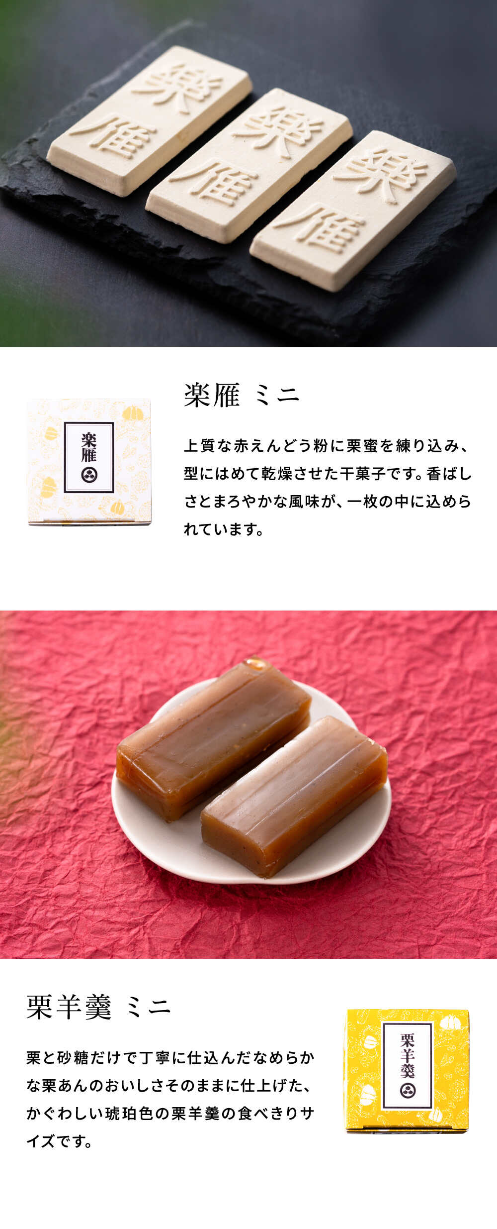 | 内容量 | 栗鹿ノ子ミニ80g×3、栗羊羹ミニ3本入×2、楽雁ミニ8枚×1 |
