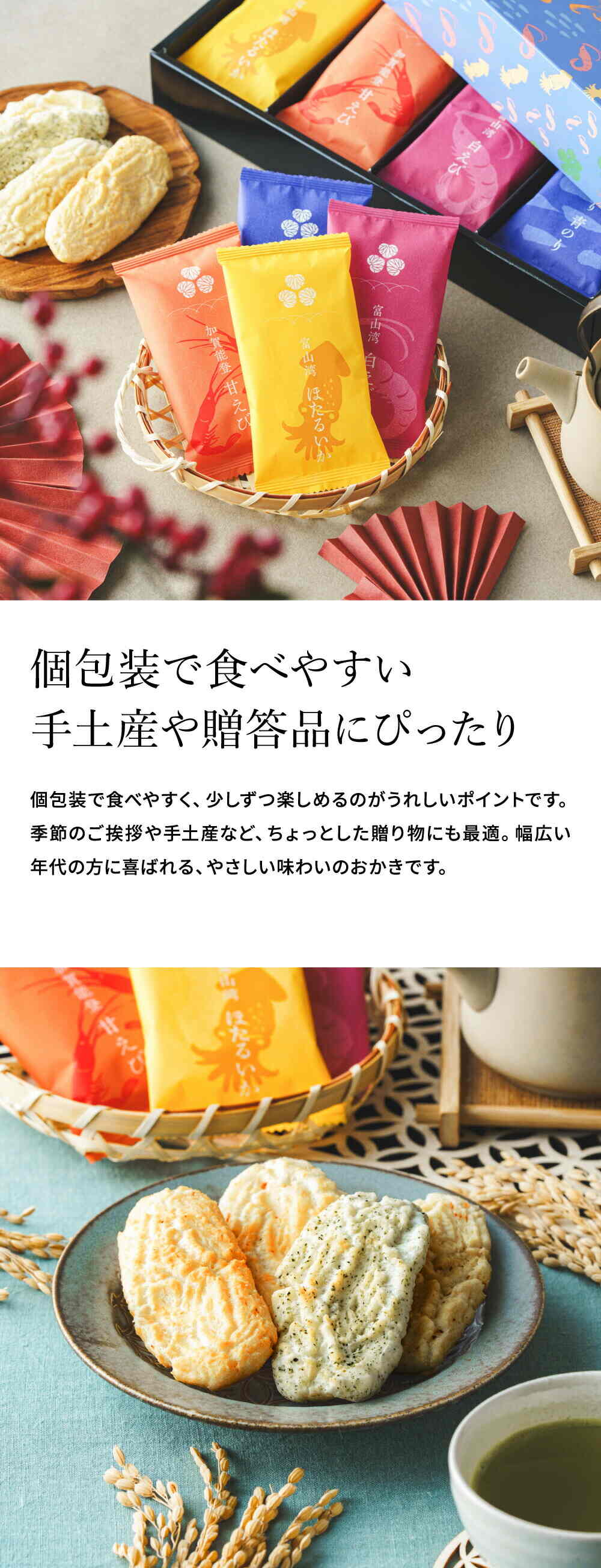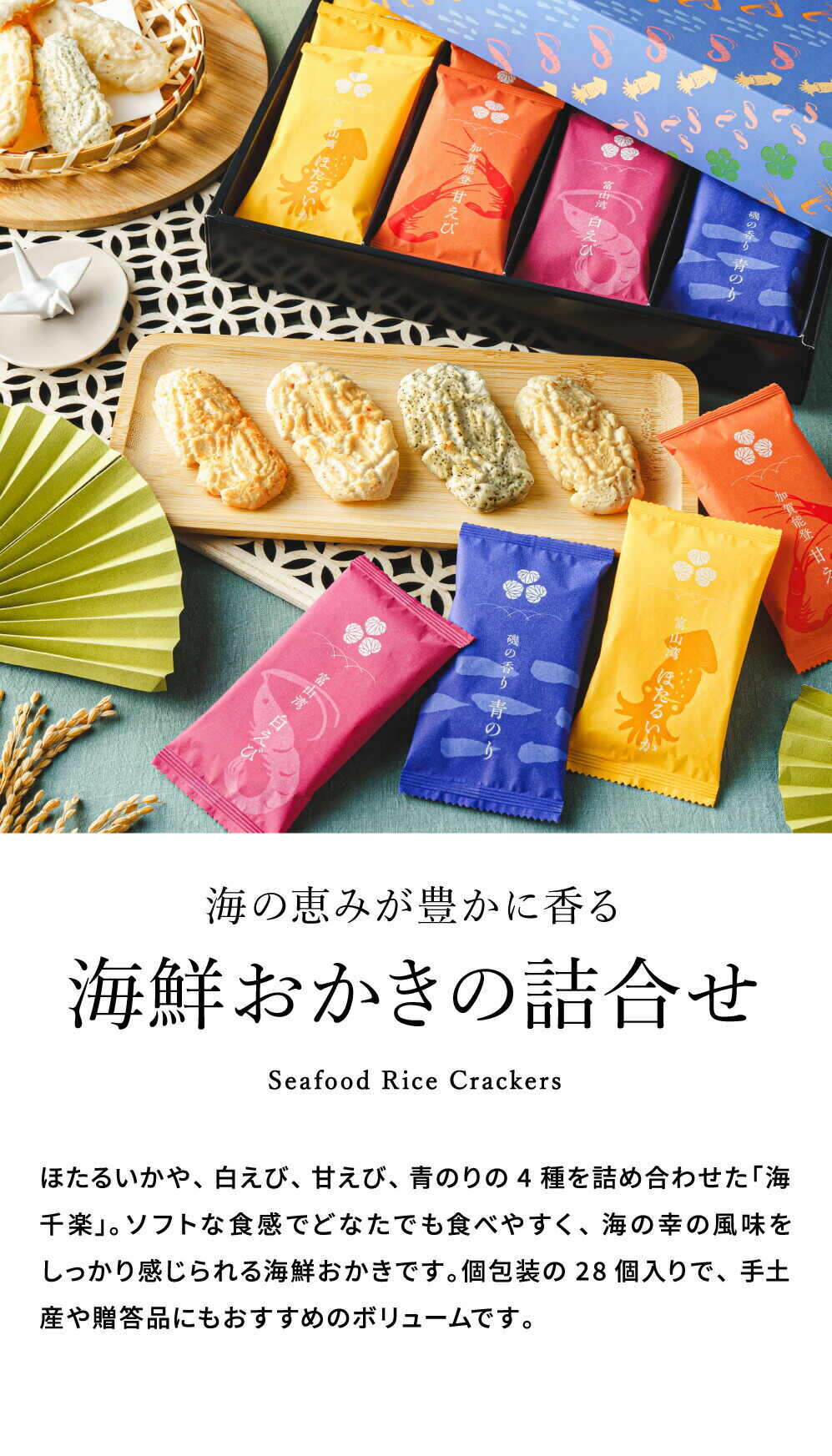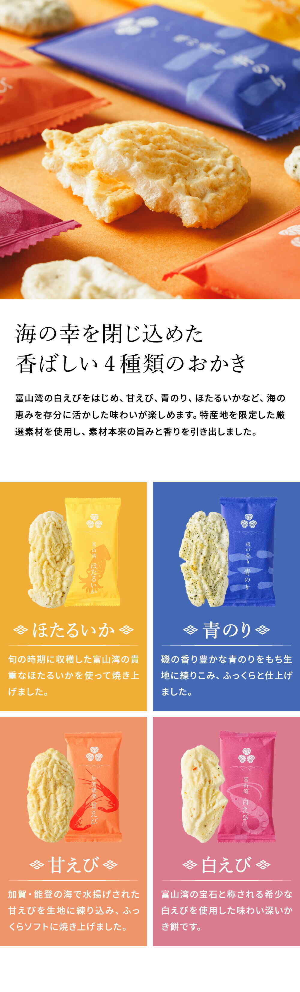 | 内容量 | 磯の香り青のり・富山湾白えび・富山湾ほたるいか・加賀能登甘えび 各7袋 計28袋 |