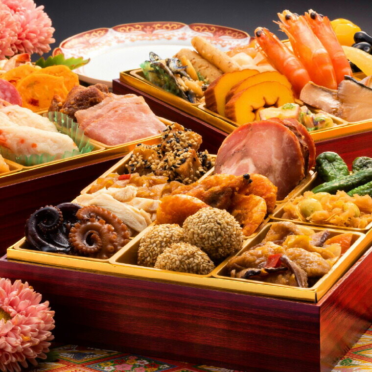 | その他詳細 1 | <三の重>九州産芝海老チリソース、中華帆立、中華風たこ旨煮、中華くらげ、黒糖ローストポーク、酢どり、蒸し鶏バンバンジー、若つみ小胡瓜、胡麻ポテ紅はるか、胡麻団子 |