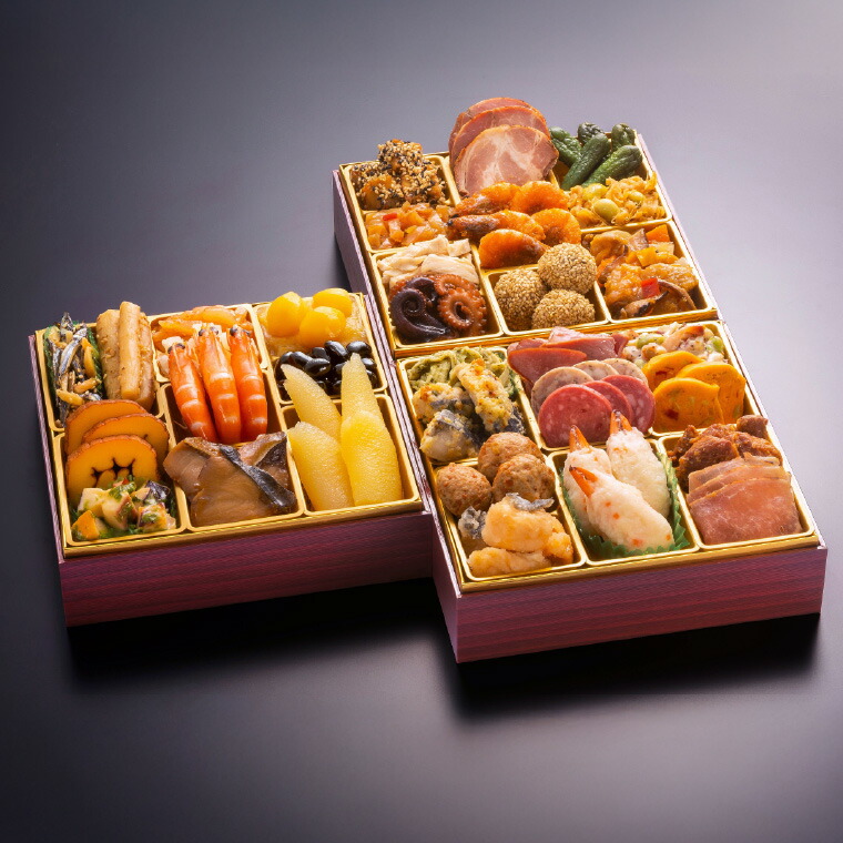 | 内容量 | <一の重>味付け数の子、祝い海老、ぶり照焼、アーモンド田作り、いか明太和え、いかサラダ、たたき牛蒡、源平なます、栗甘露煮、金団、黒豆蜜煮、伊達巻 <二の重>さわらの香味焼、爪付カニしんじょう、サーモンの酢漬け、オマール海老のビスク風、海鮮チーズサラダ、炙り生ハム炭火仕立て、タンスモーク塩レモン、ボロニアソーセージ、ボロニアソーセージハーブ、ミニハンバーグ、蒸し鶏バジル、豚ハラミ黒胡椒 続きはその他詳細1の欄にてご確認ください。 |