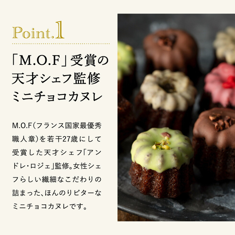M.O.F(フランス国家最優秀職人章)を若干27歳にして受賞した天才シェフ「アンドレ・ロジェ」監修。女性シェフらしい繊細なこだわりの詰まった、ほんのりビターなミニチョコカヌレです。