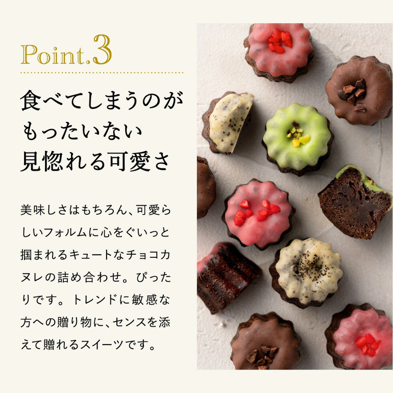 美味しさはもちろん、可愛らしいフォルムに心をぐいっと掴まれるキュートなチョコカヌレの詰め合わせは贈り物にもぴったりです。トレンドに敏感な方への贈り物に、センスを添えて贈れるスイーツです。