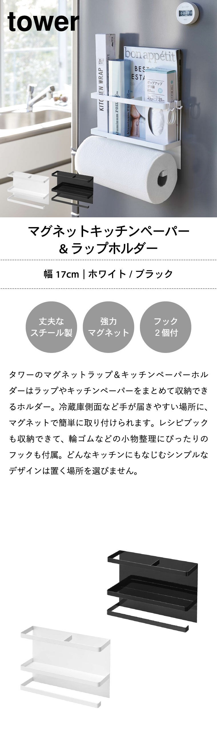山崎実業 公式 tower マグネットキッチンペーパー&ラップホルダー タワー ブラック 4397
