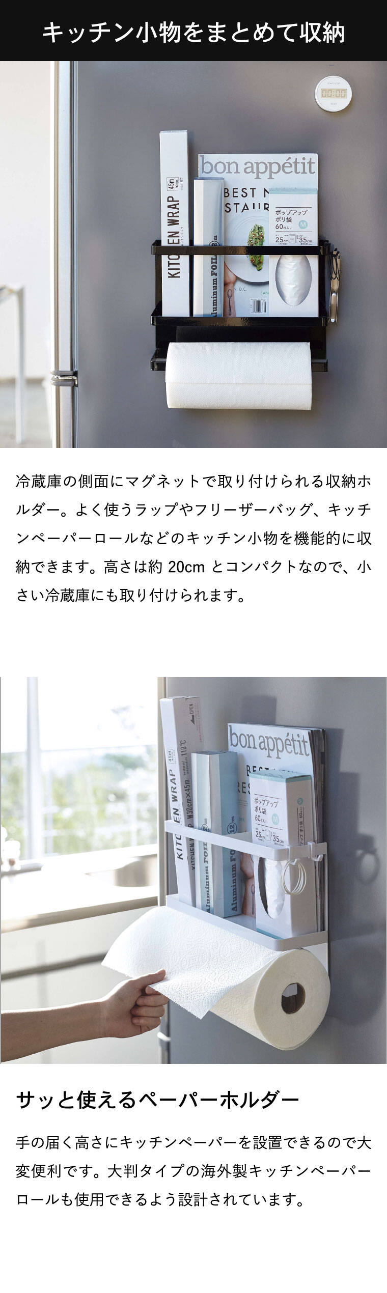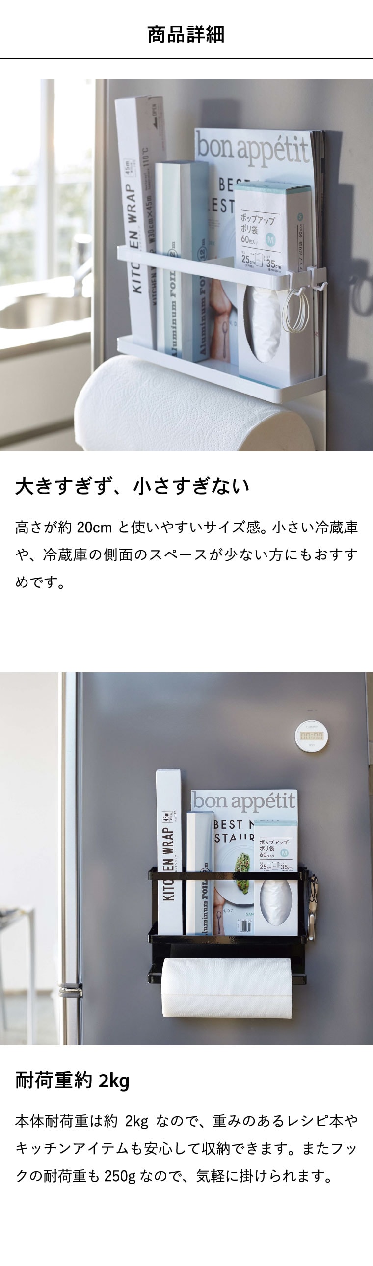 高さ約20cmなので冷蔵庫側面のスペースが少ない方や、小さい冷蔵庫の方にもオススメです。