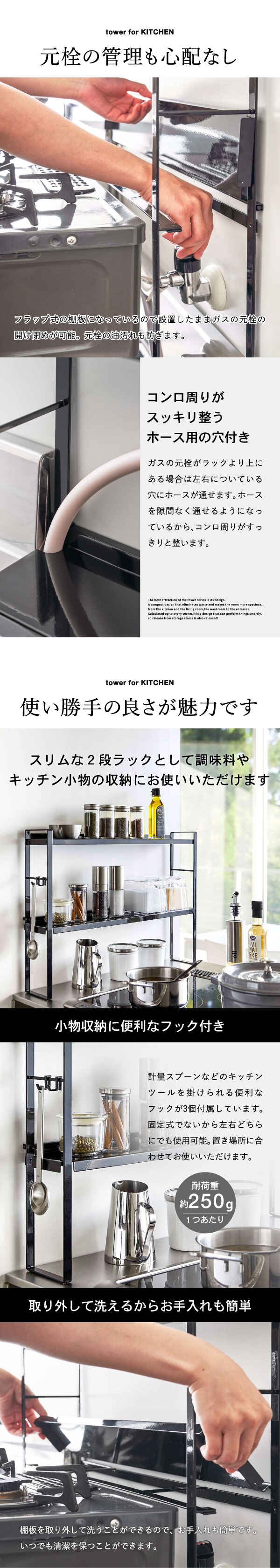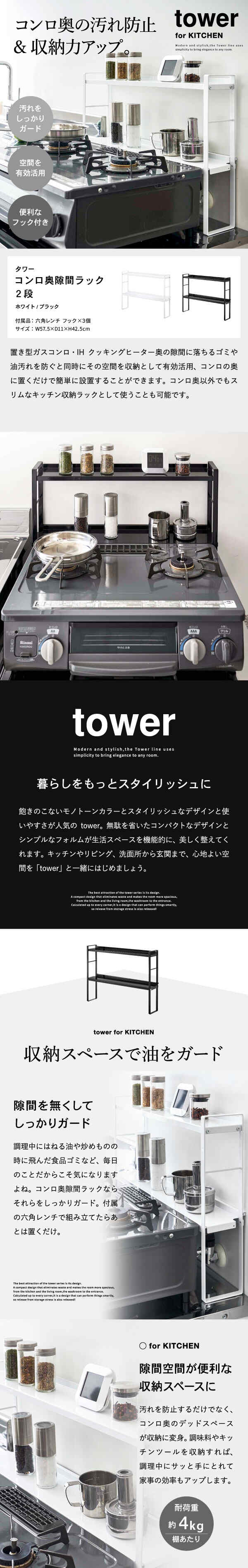 山崎実業 公式 tower コンロ奥隙間ラック 2段 タワー ホワイト 5221