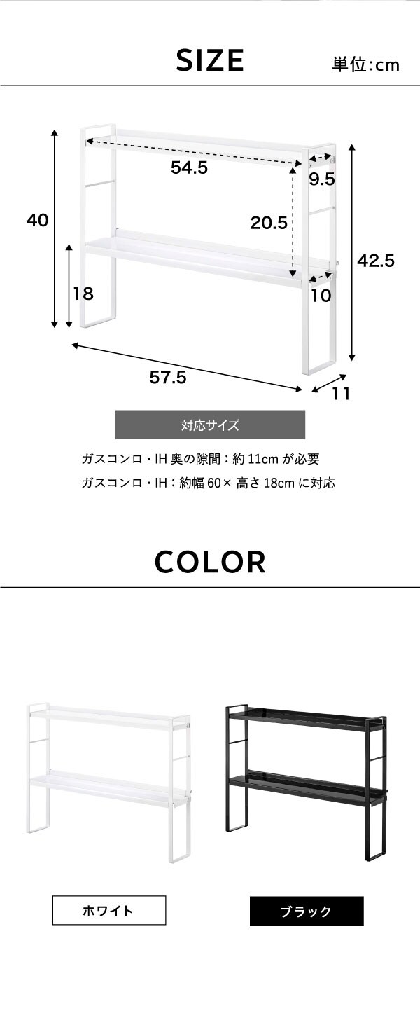 ●付属品:六角レンチ フック×3 ●耐荷重:各棚:約4kg フック1つあたり:約250g ●耐熱:200℃ ●対応サイズ:ガスコンロ・IHクッキングヒーター奥の隙間:約11cmが必要。 ガスコンロ・IHクッキングヒーター:約W60×H18cmに対応。 ●組立:組立式 |