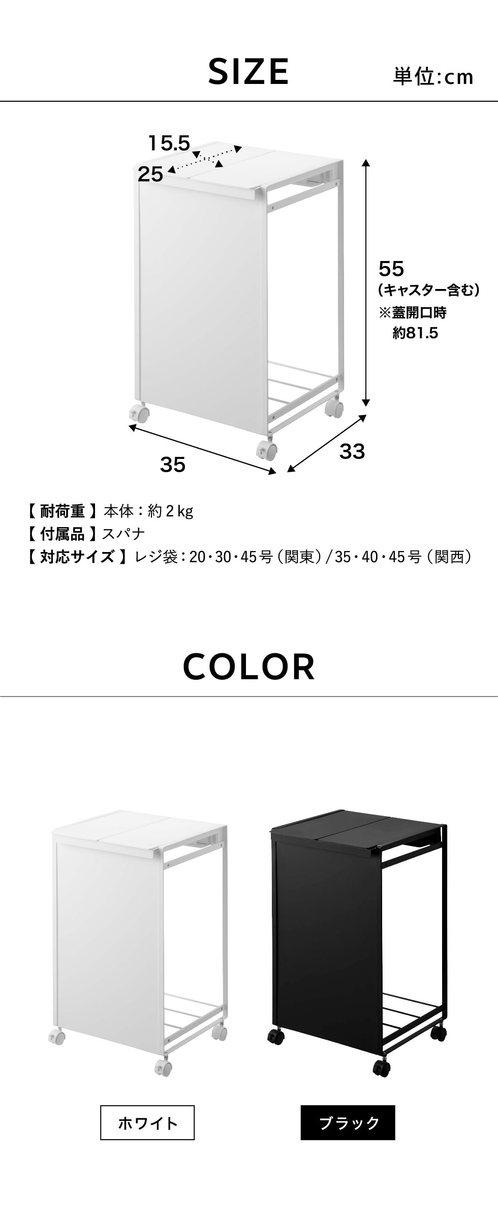 | その他詳細 1 | ●内寸サイズ: 蓋開口部1つあたり:約W15.5×D25cm ●付属品:スパナ ●耐荷重:約2kg ●耐熱:150℃ ●耐冷:-40℃ ●対応サイズ:20・30・45号(関東)35・40・45号(関西)レジ袋 ●組立式 |