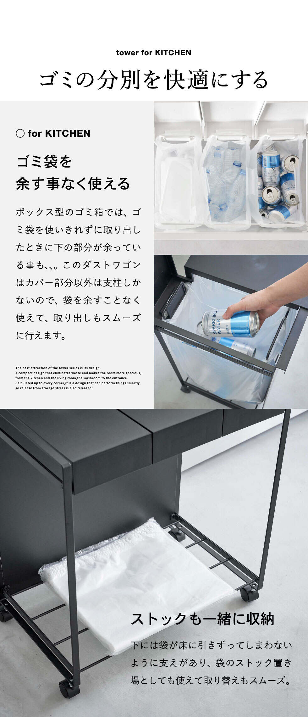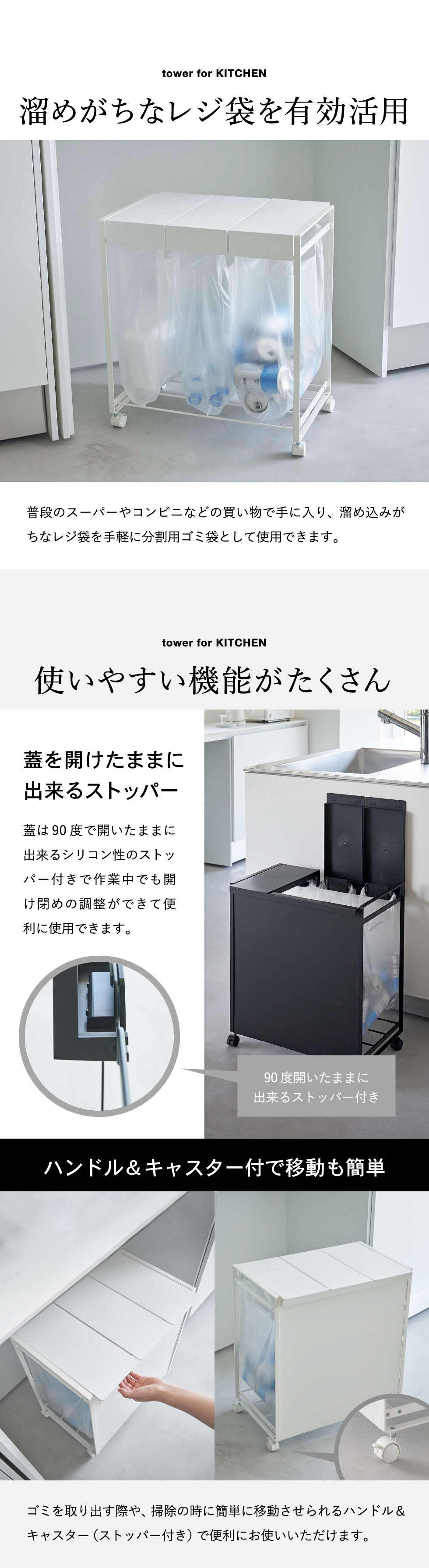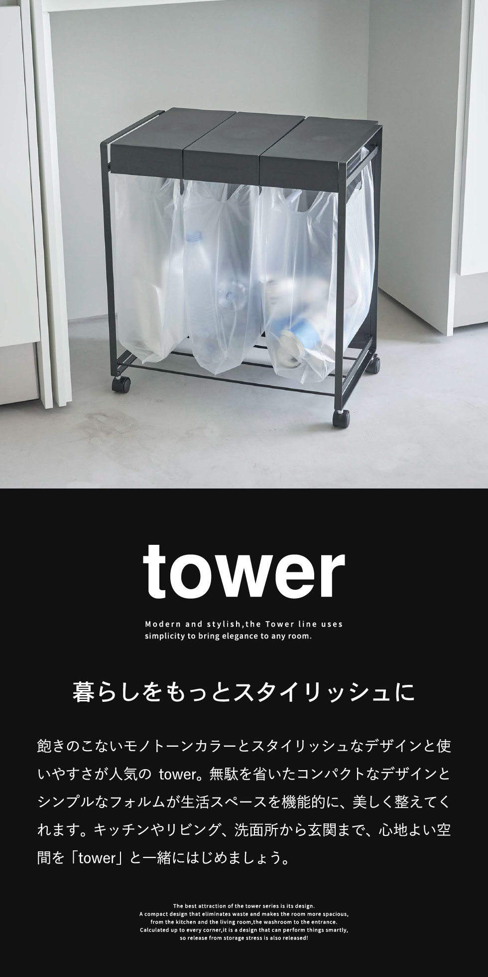 山崎実業 公式 tower 蓋付き目隠し分別ダストワゴン タワー 3分別 ダストワゴン ブラック 5978