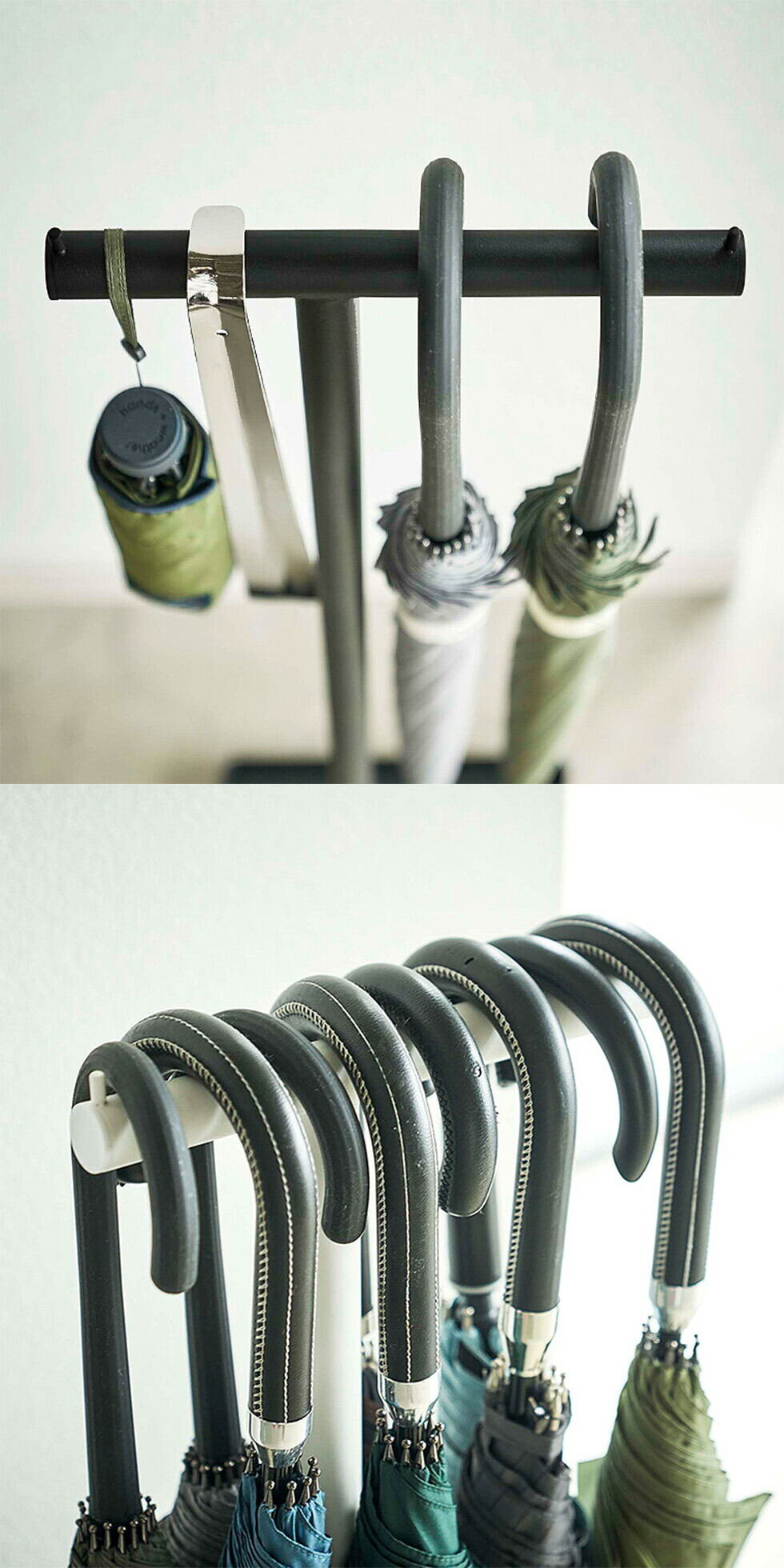 家族分の傘から日傘まで、前後入れ子にして掛ければ最大8本の傘が収納可能。斜めに置くと色んな方向に向いて乱雑に見えがちな傘も、直線のバーに掛けることで、全て縦向きに収納できて見た目もスッキリです。