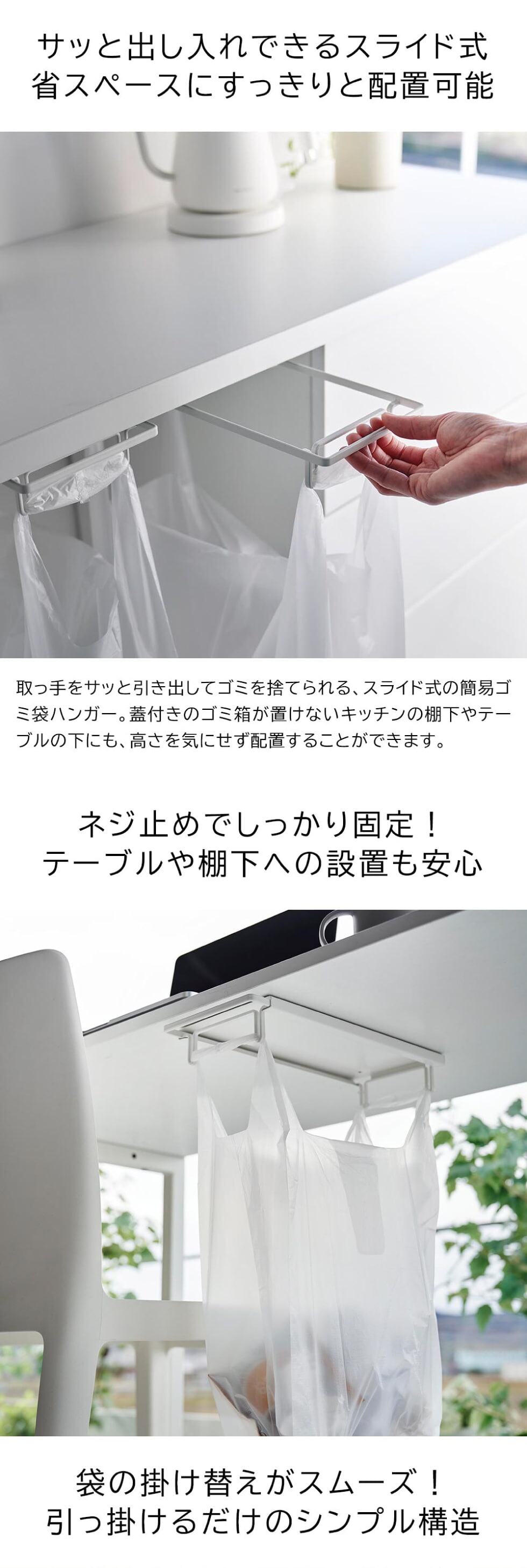 | その他詳細 1 | ●内寸サイズ:ハンガーフレーム開口時:約W12.5×D21cm ハンガー部:約W9.5×D24×H3cm ●耐荷重:約2kg ●対応サイズ:20・30・45号のレジ袋(関東) 35・40・45号のレジ袋(関西) 30L・45Lの取っ手付きゴミ袋 ●取り付け可能なテーブル・棚板 天板が木製・積層合板製で、厚さが約1.5cm以上あり、天板裏の約W13.5×D30.5cm以内に干渉する、幕板・柱・脚がないテーブル・棚板。 |