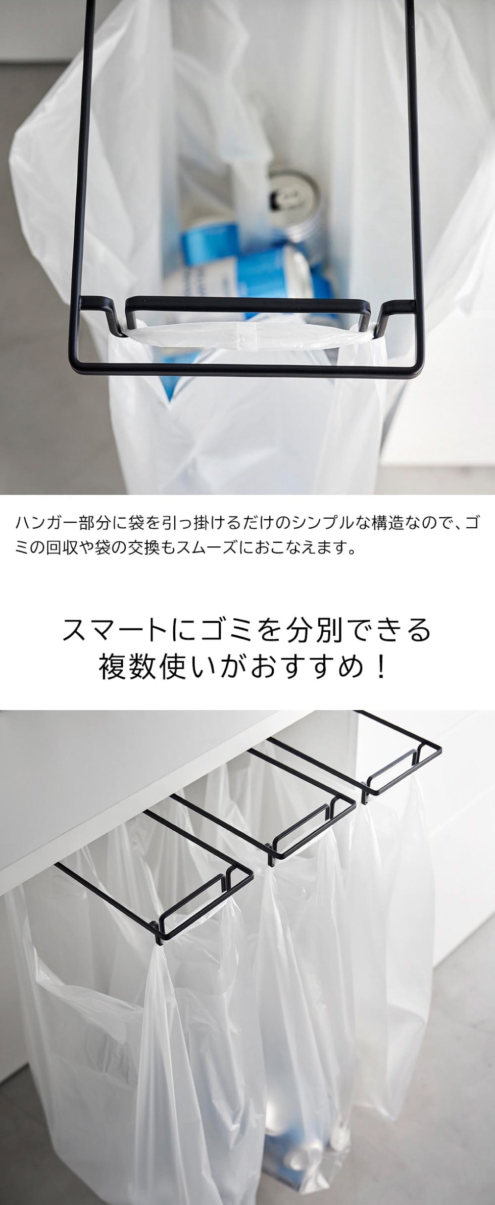 レジ袋や市販の取っ手付きゴミ袋を引っ掛けて使用する簡易ゴミ袋ハンガー。