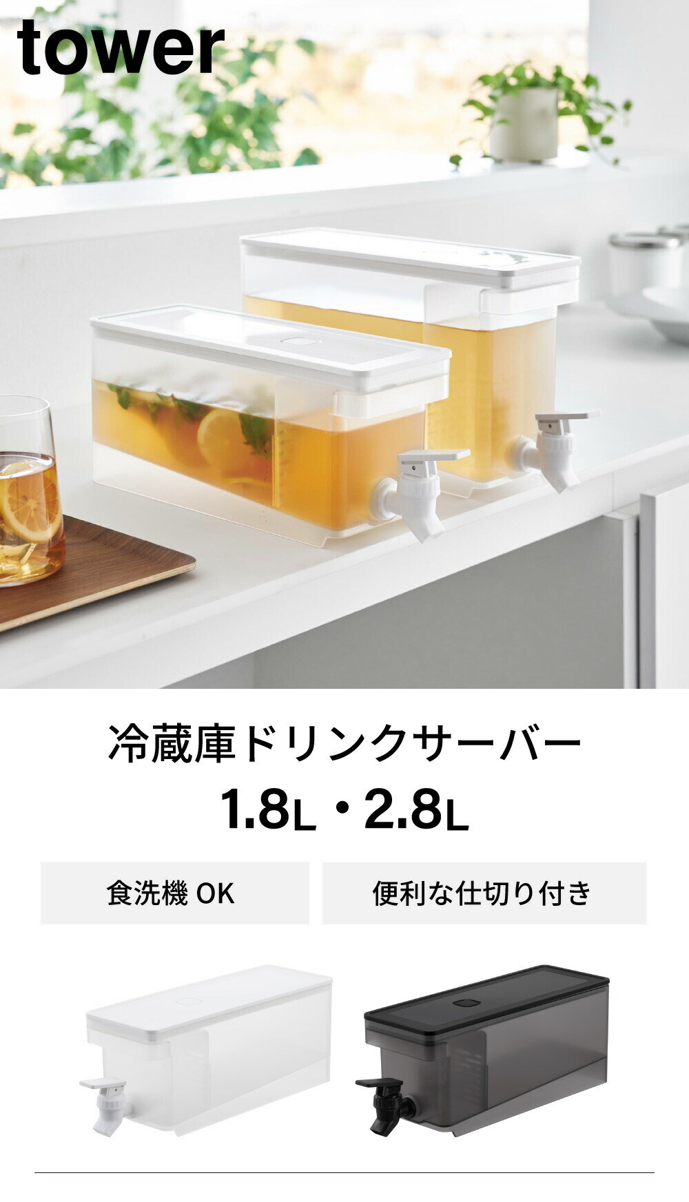 山崎実業 公式 tower 冷蔵庫ドリンクサーバー タワー 1.8L ブラック 1585