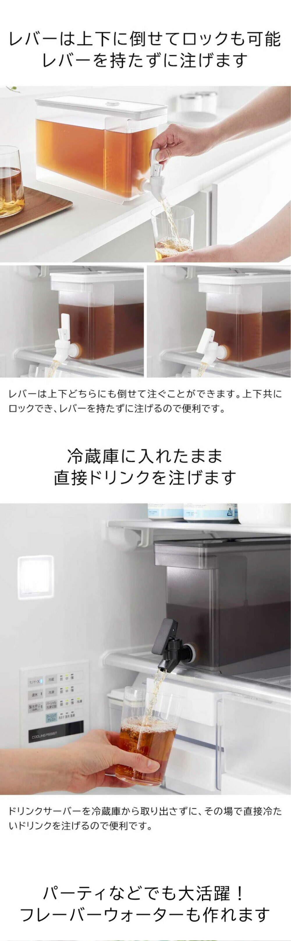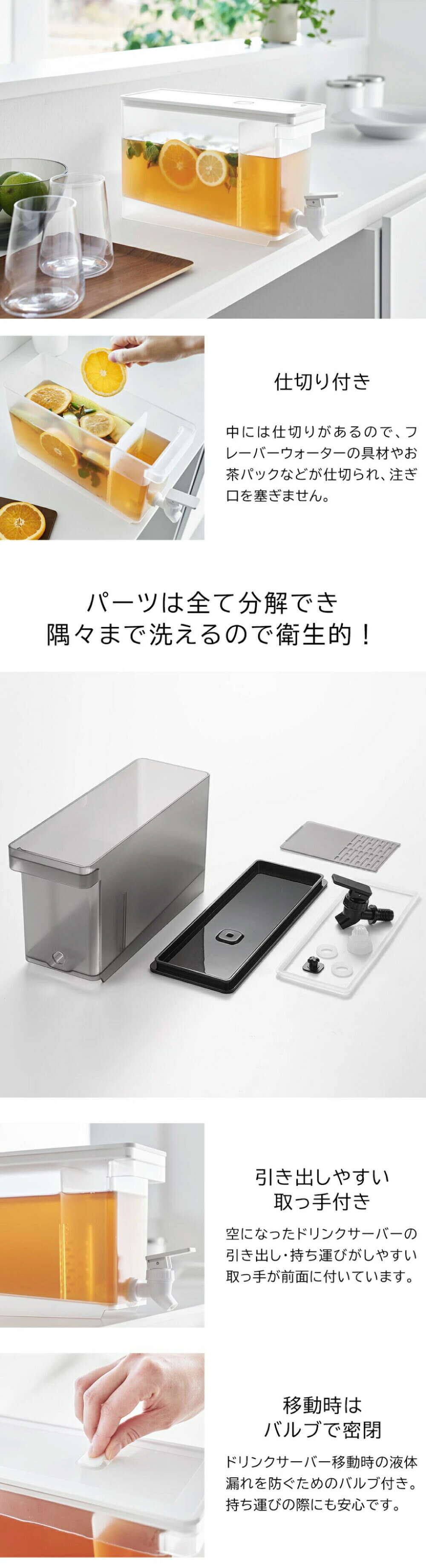 | その他詳細 1 | ●耐熱 容器・レバー:90℃ 蓋・仕切り板・蛇口・キャップ・パッキン・バルブ:120℃ ●耐冷 容器・レバー・蓋・仕切り板・蛇口・キャップ・パッキン・バルブ:-40℃ ●仕様 食洗機対応:可 組立式 |