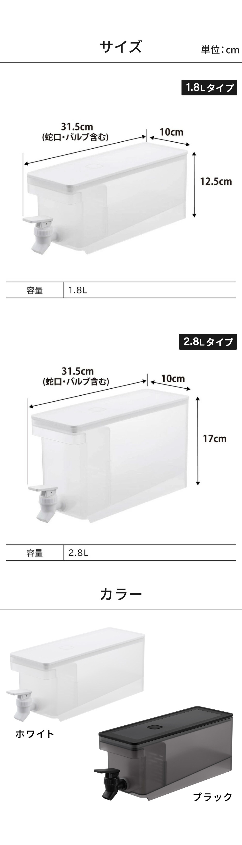 | 原材料/素材/材質 | 容器:メタクリルスチレン 蓋・仕切り板・蛇口・キャップ:ポリプロピレン パッキン・バルブ:シリコーン レバー:ABS樹脂 蛇口バネ:ステンレス鋼 |