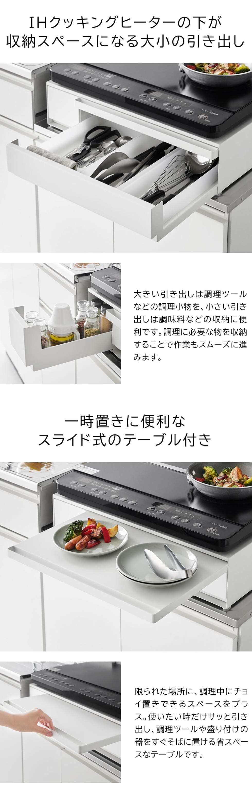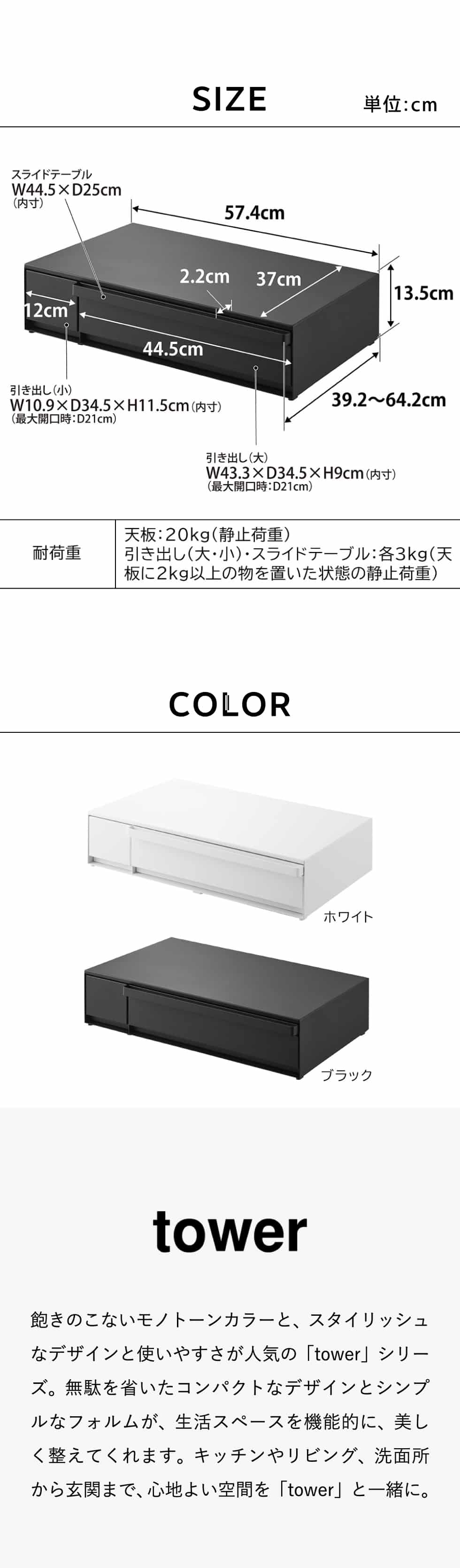 | その他詳細 1 | ●内寸サイズ 天板:W57.4×D37cm スライドテーブル:W44.5×D25cm 引き出し(大):W43.3×D34.5×H9cm(最大開口時:D21cm) 引き出し(小):W10.9×D34.5×H11.5cm(最大開口時:D21cm) ●耐荷重 天板:20kg(静止荷重) 引き出し(大・小)・スライドテーブル:各3kg(天板に2kg以上の物を置いた状態の静止荷重) |