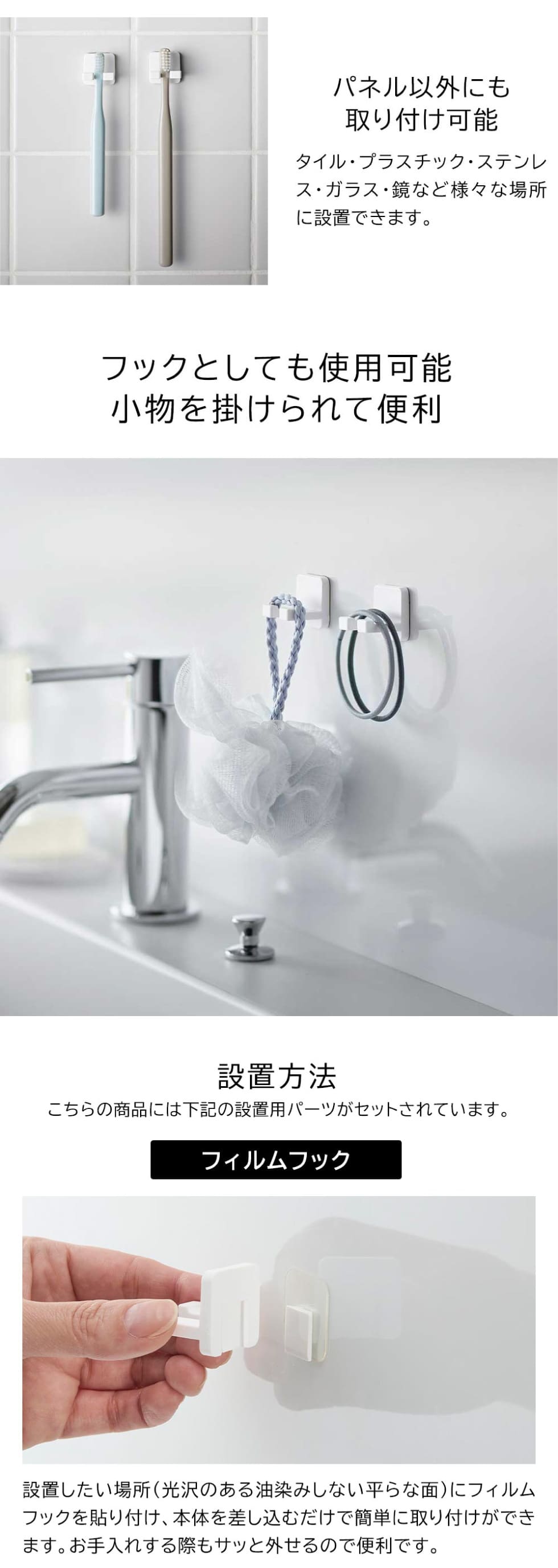 | その他詳細 1 | 耐荷重:ホルダー1つあたり:100g(静止荷重) 耐熱: 60℃ 耐冷: -10℃ 使用できる面 光沢のある平らな油染みしない面で、フィルムフックの接着面よりも大きい面・タイル・プラスチック・ステンレス・ガラス・鏡面(ミラー)・金属塗装面・人工大理石 ※表面加工・材質・状態などによっては貼り付けできない場合があります。 |