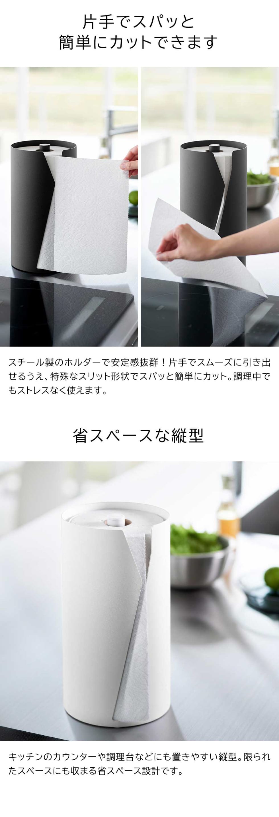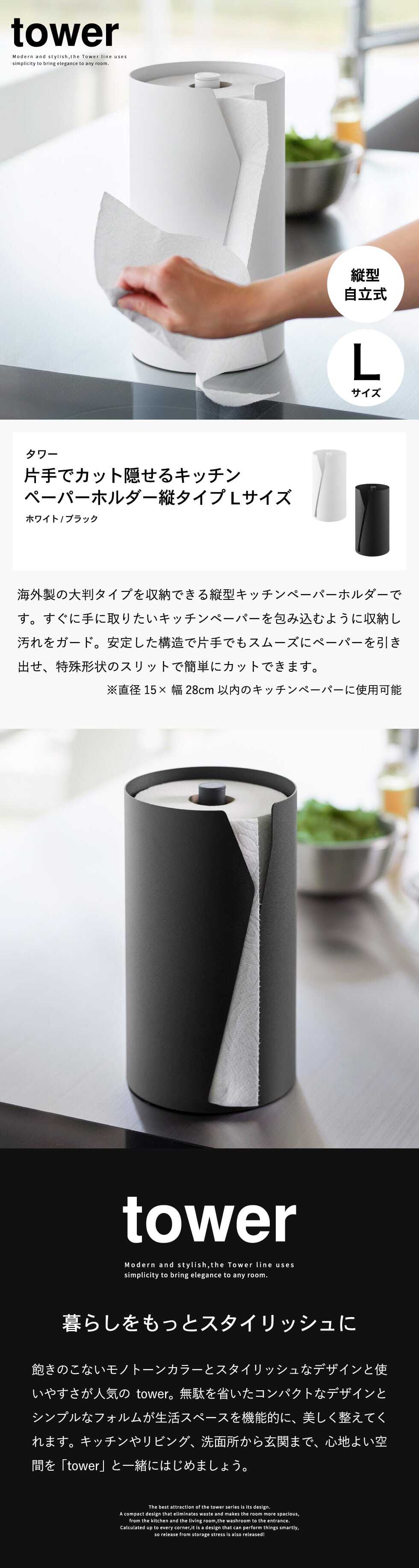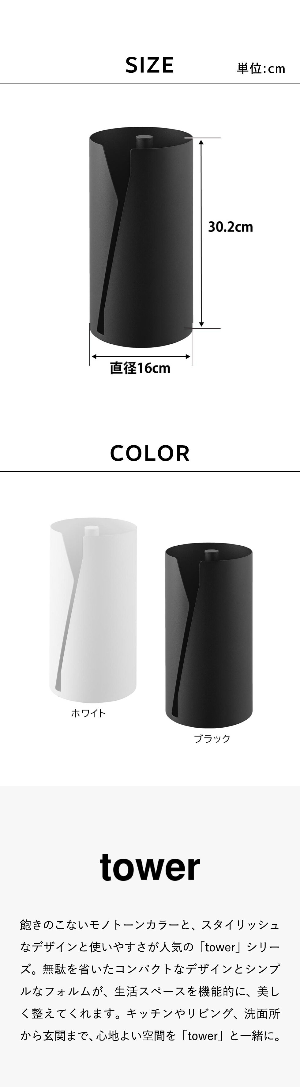 山崎実業 tower 片手でカット隠せるキッチンペーパーホルダー タワー 縦タイプ L 10041 10042 / ブラック