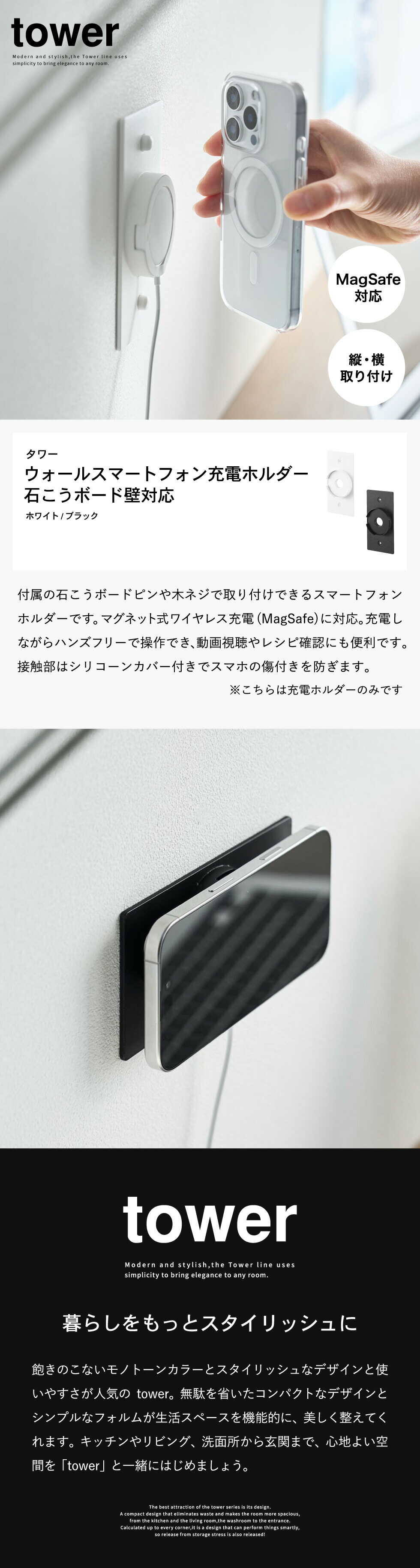 tower ウォールスマートフォン充電ホルダー タワー 石こうボード壁対応 山崎実業 10084 10085 ホワイト ブラック / ホワイト