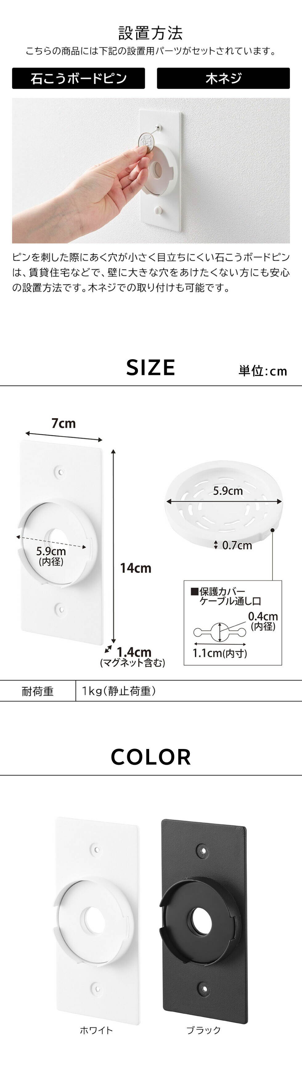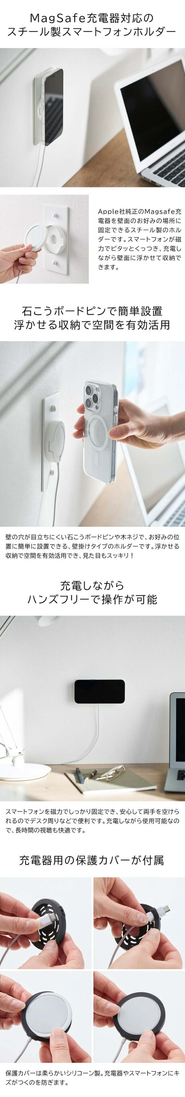 | その他詳細 1 | 付属品:石こうボードピンセット(取り付けピース×2 クギ×6 キャップ×2) 木ネジ×2 厚み調整シート 調整シール 耐荷重:1kg(静止荷重) 対応サイズ:■対応機種 Apple純正MagSafe充電器(25W型番A2580・A3250・15W型番A2140) ■対応サイズ Apple純正MagSafe充電器(25W型番A2580・A3250:厚さ4.37mm・外径55.5mm 15W型番A2140:厚さ5.3mm・外径55.9mm) 厚さ4.37~5.3mm・外径55.5~55.9mmのワイヤレス充電器 ※ワイヤレス充電器のサイズや形状によっては取り付けできない場合があります。 取り付け可能な壁 石こうボードピン使用時:壁紙・布壁紙・ビニール壁紙貼りなどの石こうボード、薄ベニヤ 木ネジ使用時:柱・板壁(厚さ1cm以上)・プリント合板(裏側に水平にサンがある場所)・裏に下地材(間柱)が入っている壁 |