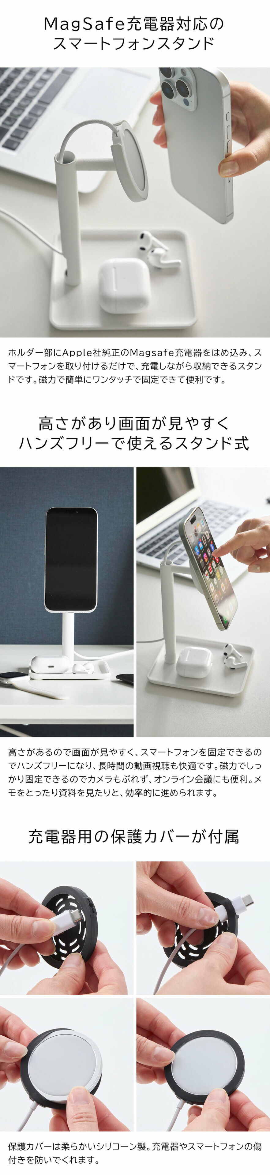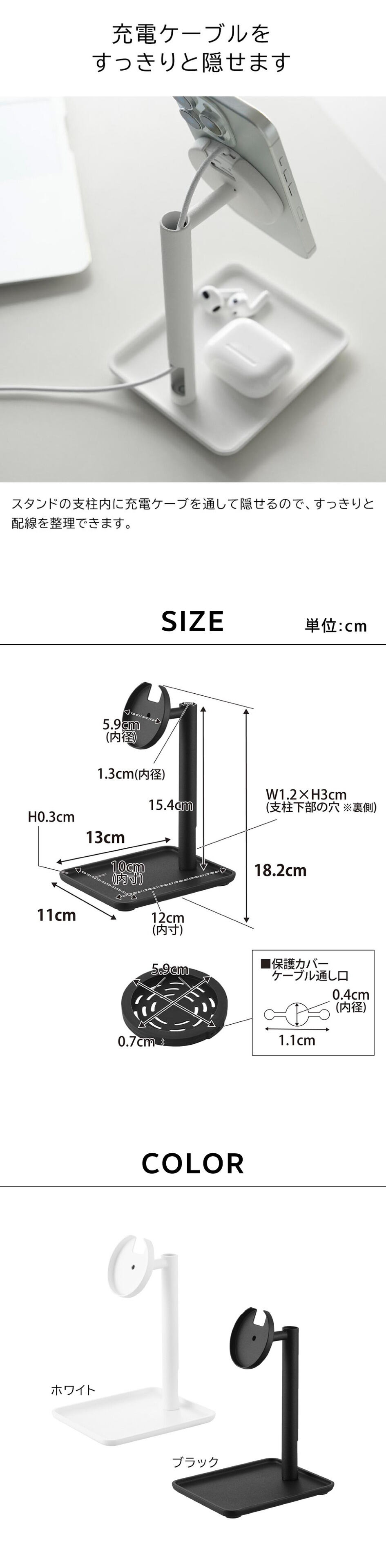 | サイズ/寸法 | 商品サイズ: 本体:W11×D13×H18.2cm、保護カバー:W5.9×D5.9×H0.7cm 内寸サイズ: ホルダー部:内径5.9cm 保護カバーケーブル通し口:W1.1cm・内径4mm 支柱上部の穴:内径:1.3cm 支柱下部の穴:W1.2×H3cm トレー部:W10×D12×H0.3cm |