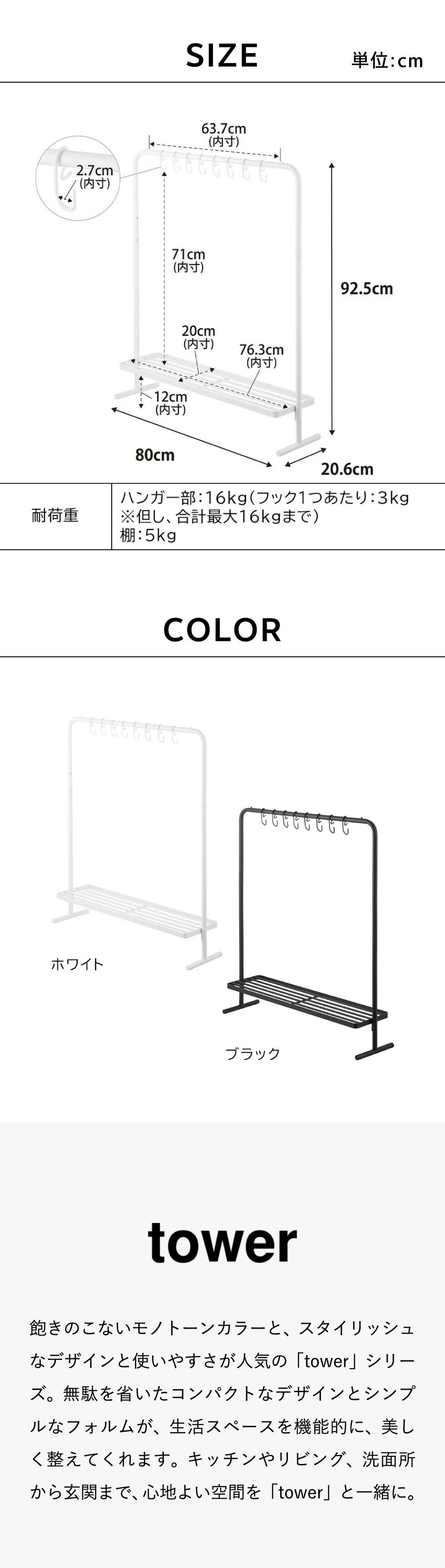 | その他詳細 1 | 付属品:六角レンチ 耐荷重:ハンガー部:16kg(フック1つあたり:3kg ※但し、合計最大16kgまで) 棚:5kg(静止荷重) 組立式 |
