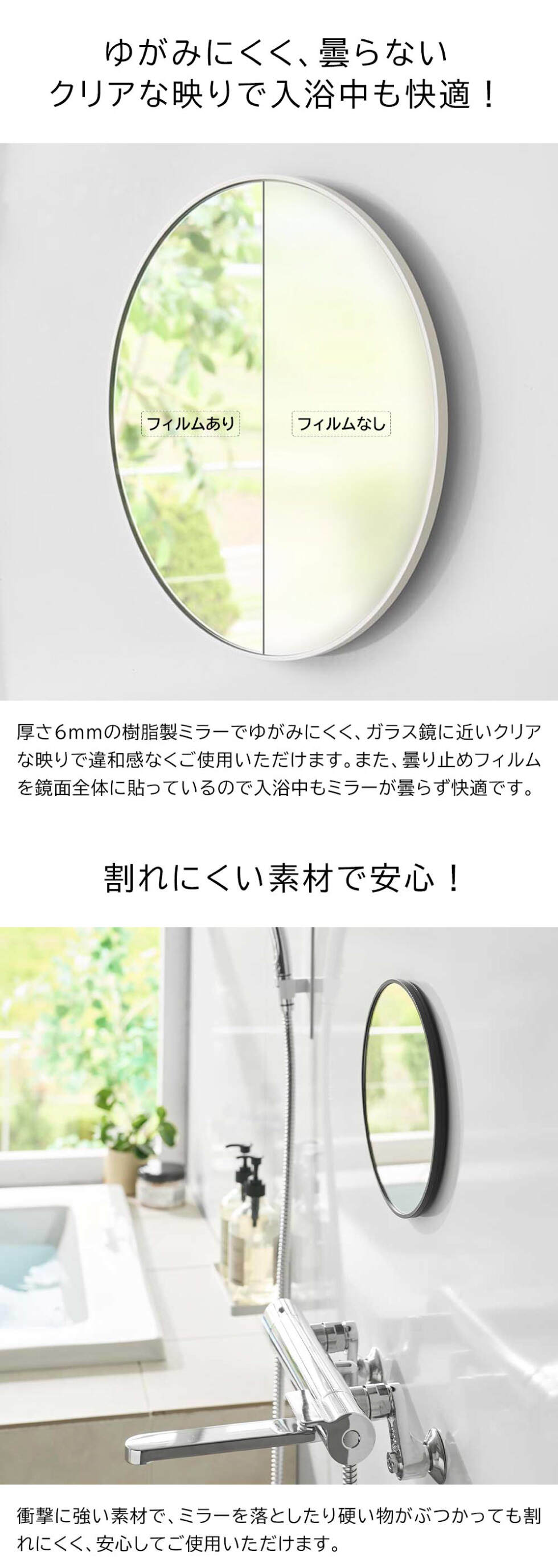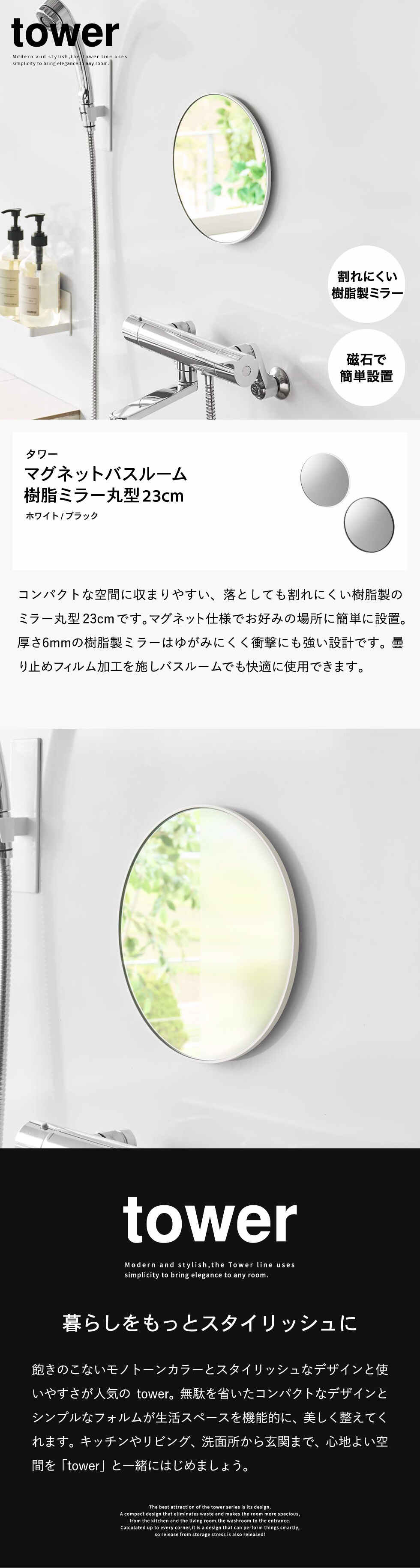 tower マグネットバスルーム樹脂ミラー タワー 丸型 23cm 山崎実業 10171 10172 / ブラック