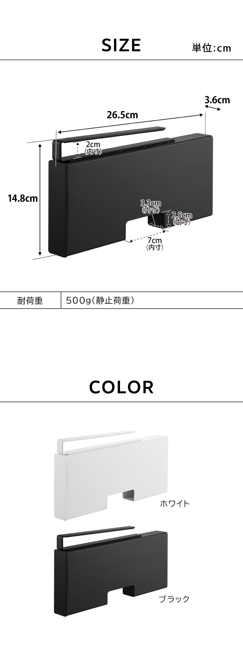 | その他詳細 1 | 耐荷重:500g(静止荷重) 対応サイズ:幅26(マチ含まず)×高さ38cmまでのポリ袋を約100枚(袋の厚さにより枚数は異なります。) 取り付け可能な吊り戸棚 棚板の厚さ:1.4~2cm 棚板の幅:3.6cm以上 棚板の奥行き:27cm以上 扉と棚板との隙間:3mm以上が必要です。※設置場所のサイズや厚さ・形状・材質によっては取り付けできない場合があります。※ガラス戸へのご使用はお避け下さい。 |