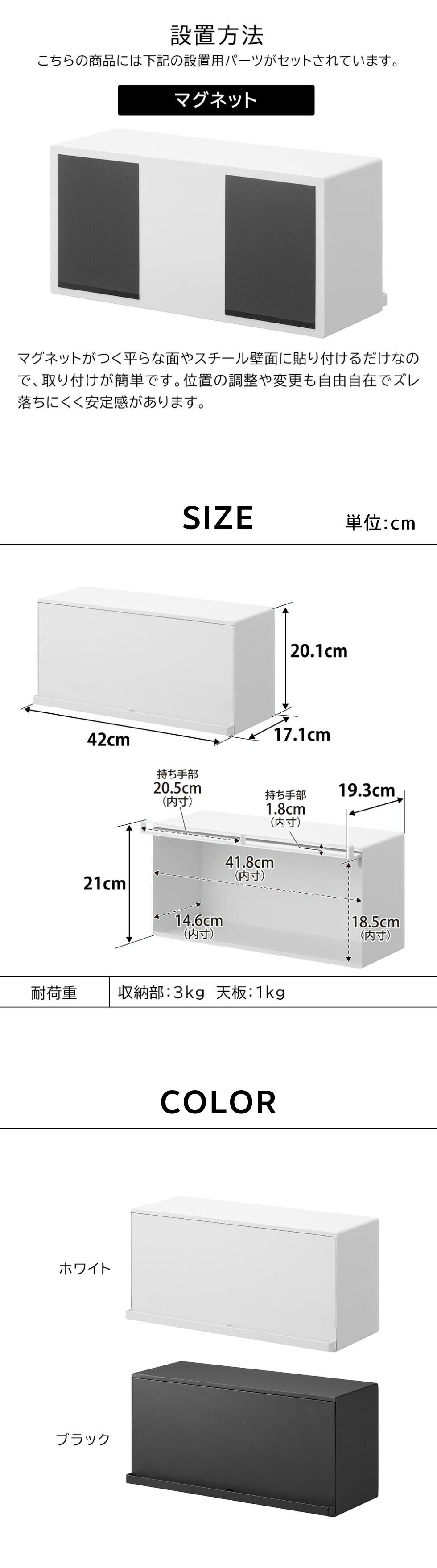 | その他詳細 1 | 耐荷重:収納部:3kg 天板:1kg(静止荷重) 使用できる面 マグネットがつく凹凸のない平らな面・スチール面 |