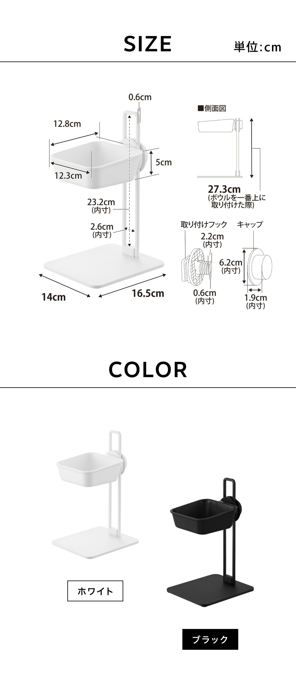 | 原材料/素材/材質 | 支柱・台座:スチール(粉体塗装) ボウル・取り付けフック・固定キャップ:ポリプロピレン 緩衝材:シリコーンゴム |