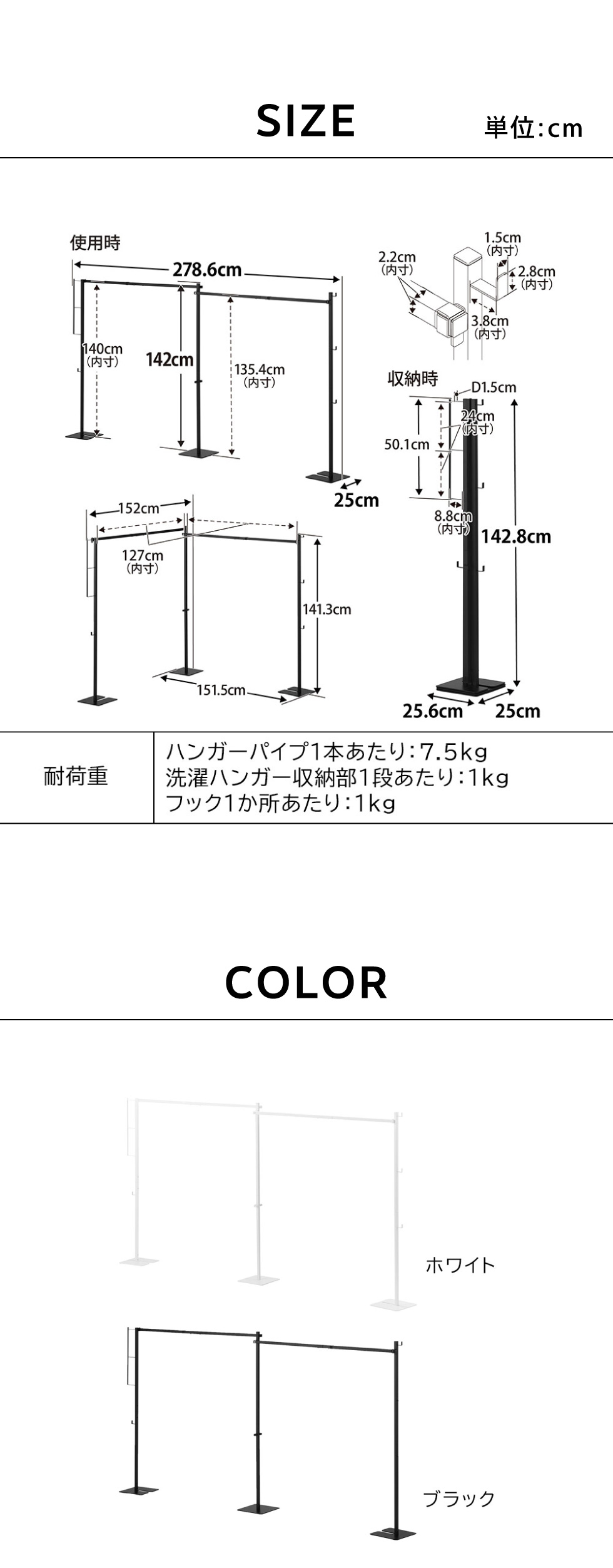 | サイズ/寸法 | 商品サイズ: 使用時:W278.6×D25×H142cm、収納時:W25.6×D25×H142.8cm 内寸サイズ: ハンガーパイプ1本あたり:W127×D2.2×H2.2cm 洗濯ハンガー収納部1か所あたり:W8.8×D1.5×H24cm フック1か所あたり:W3.8×D1.5×H2.8cm |