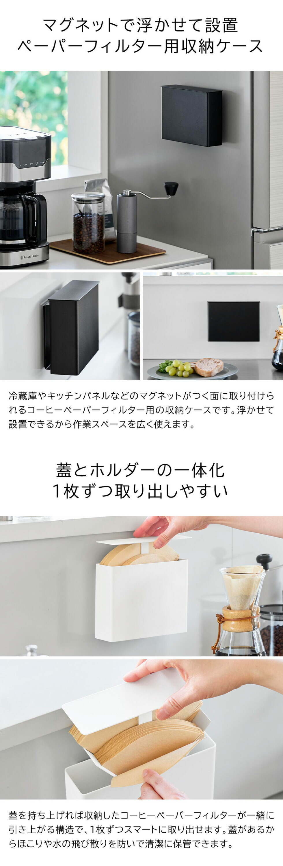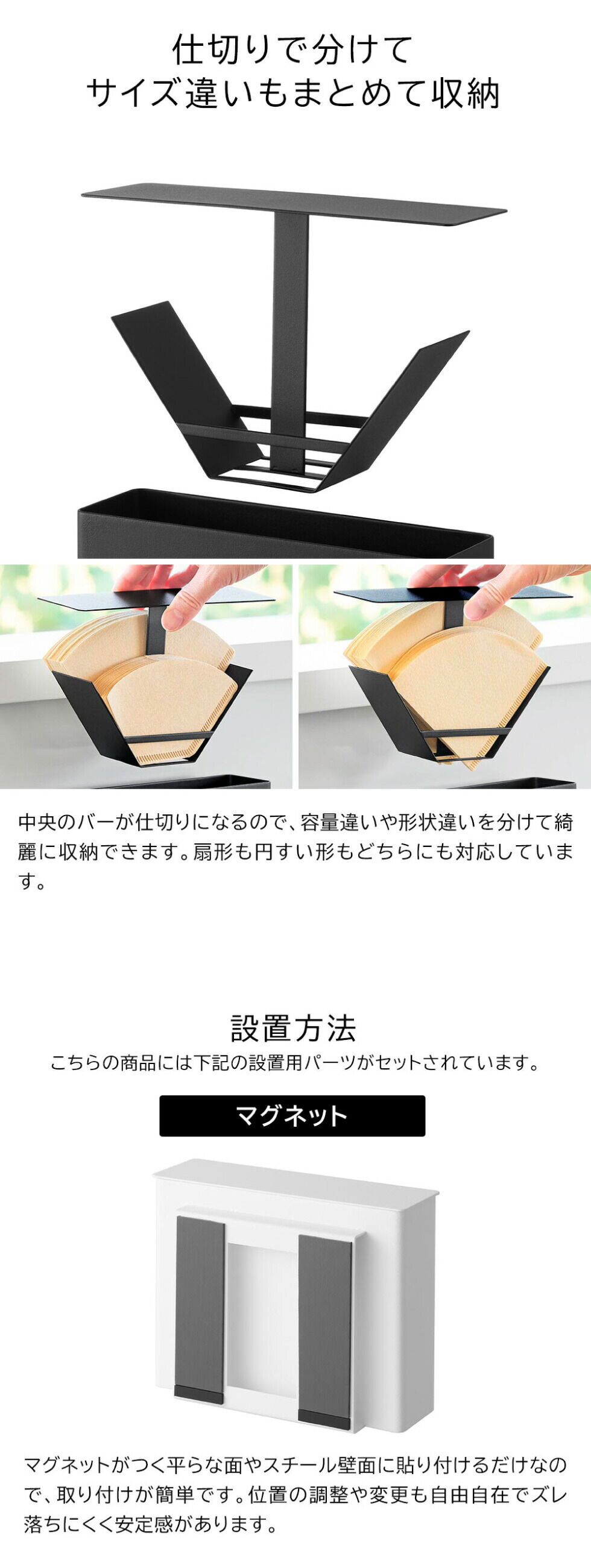 | その他詳細 1 | 耐荷重:500g(静止荷重) 対応サイズ:収納可能数 扇形:1~2・2~4杯用ペーパーフィルター約100枚/片側約50枚(目安) 円すい形:1~2・1~4杯用ペーパーフィルター約60枚/片側約30枚(目安) ※フィルターのサイズや厚さ、形状等によって異なります。 使用できる面 マグネットがつく凹凸のない平らな面 スチール面 |