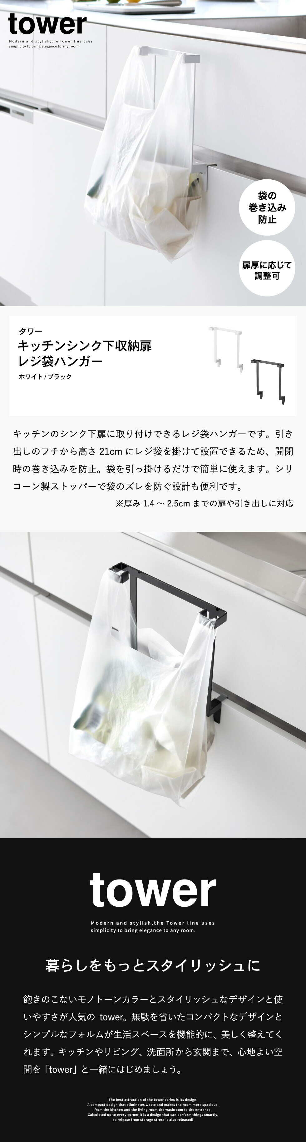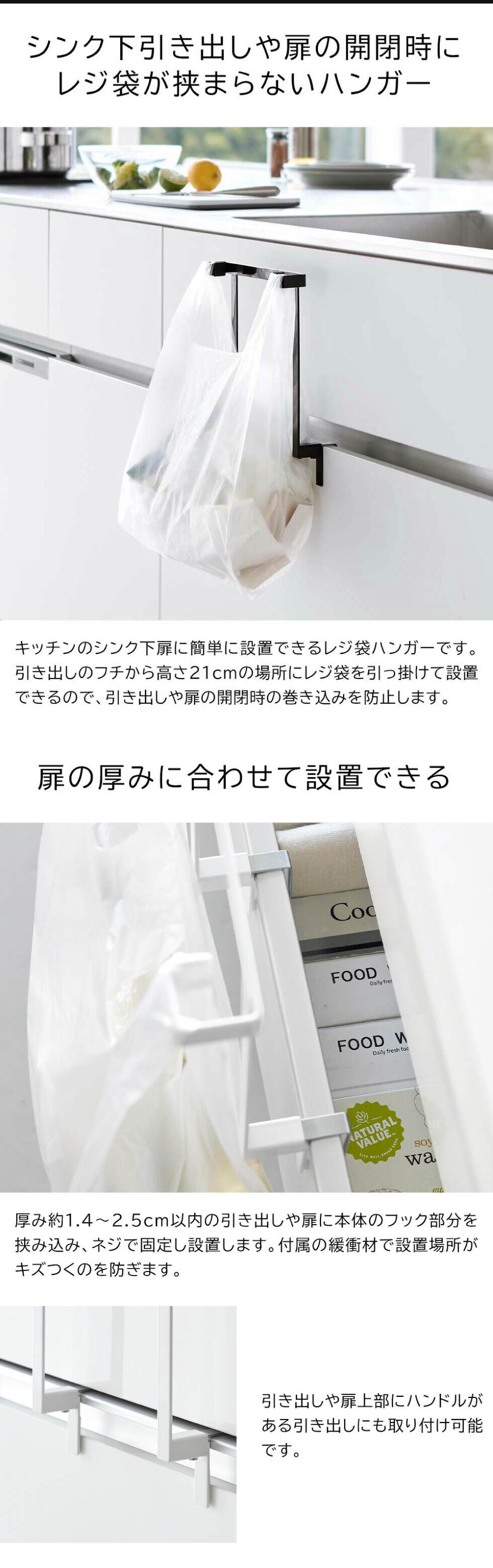 山崎実業 tower キッチンシンク下収納扉レジ袋ハンガー タワー 10332 10333 / ホワイト
