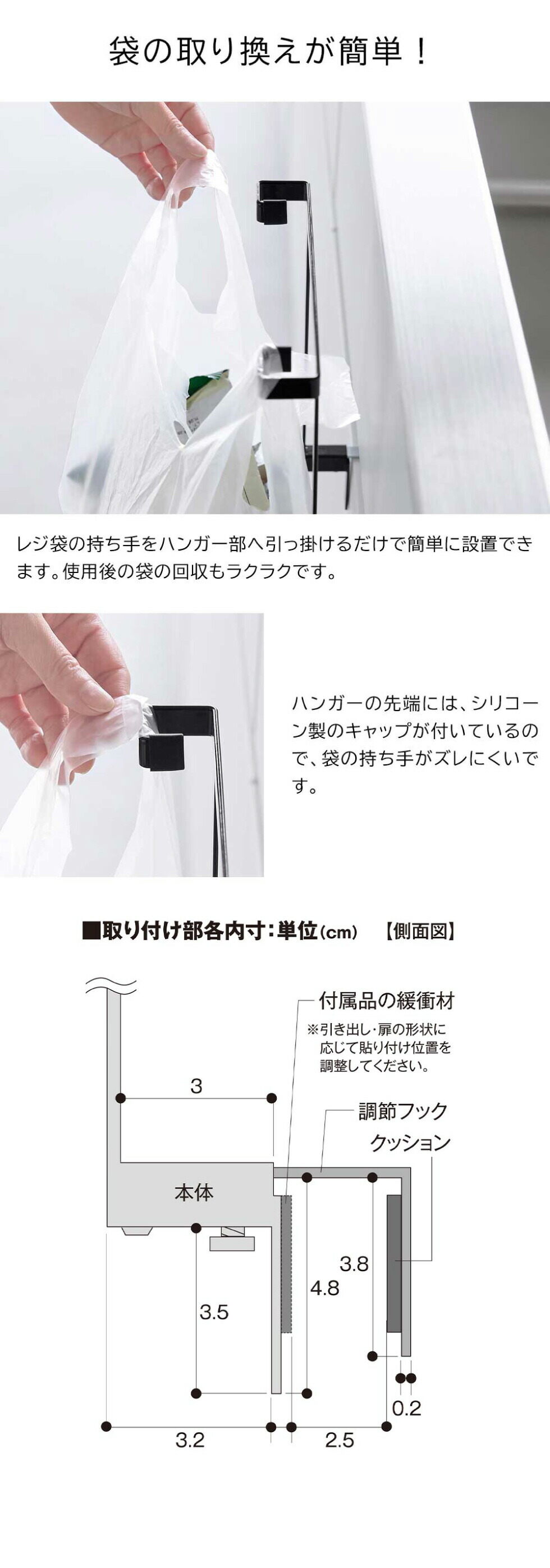 | その他詳細 2 | 取り付け可能な引き出し・扉 幅:22cm以上(扉のハンドル等を含まず) 厚さ:1.4~2.5cm 上部との隙間:0.3cm以上 ※本製品は屋内の一般的な平面の流し台や洗面台の引き出し・扉を対象にしています。 ※ガラス戸やキズのつきやすい引き出し・扉へのご使用はお避けください。 ※設置する引き出し・扉のサイズや厚さ、形状、材質によっては取り付けできない場合があります ※プッシュオープン扉は取り付けできません。 |