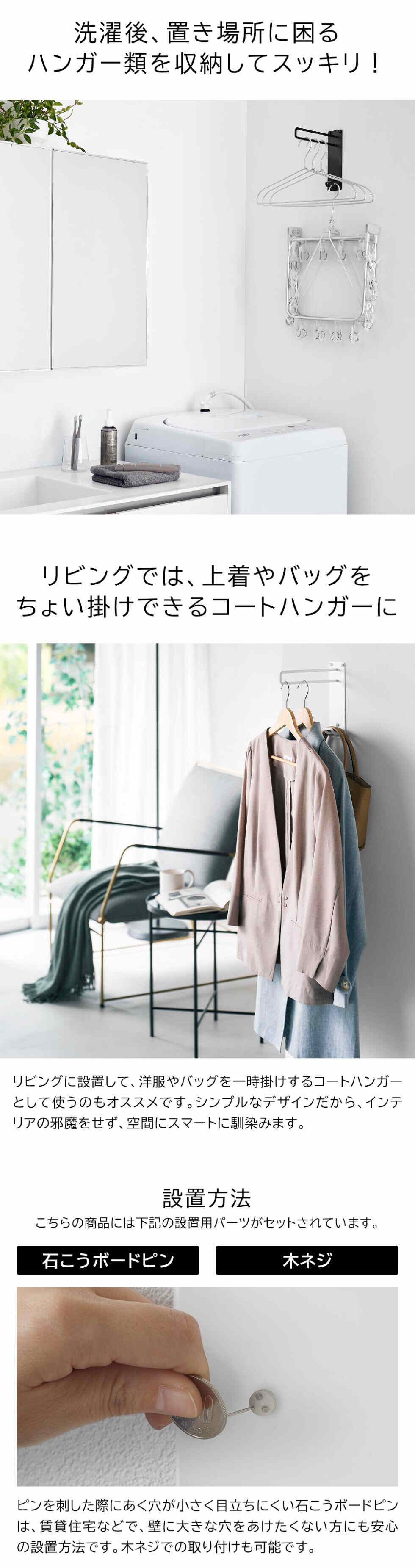 | その他詳細 1 | 付属品:石こうボードピンセット(取り付けピース×3 クギ×9 キャップ×3) 木ネジ×3 耐荷重:ハンガー部:1.5kg フック部:2kg(静止荷重) 取り付け可能な壁 石こうボードピン使用時:壁紙・布壁紙・ビニール壁紙貼りなどの石こうボード、薄ベニヤ 木ネジ使用時:柱・板壁(厚さ1cm以上)・プリント合板(裏側に水平にサンがある場所)・裏に下地材(間柱)が入っている壁 |