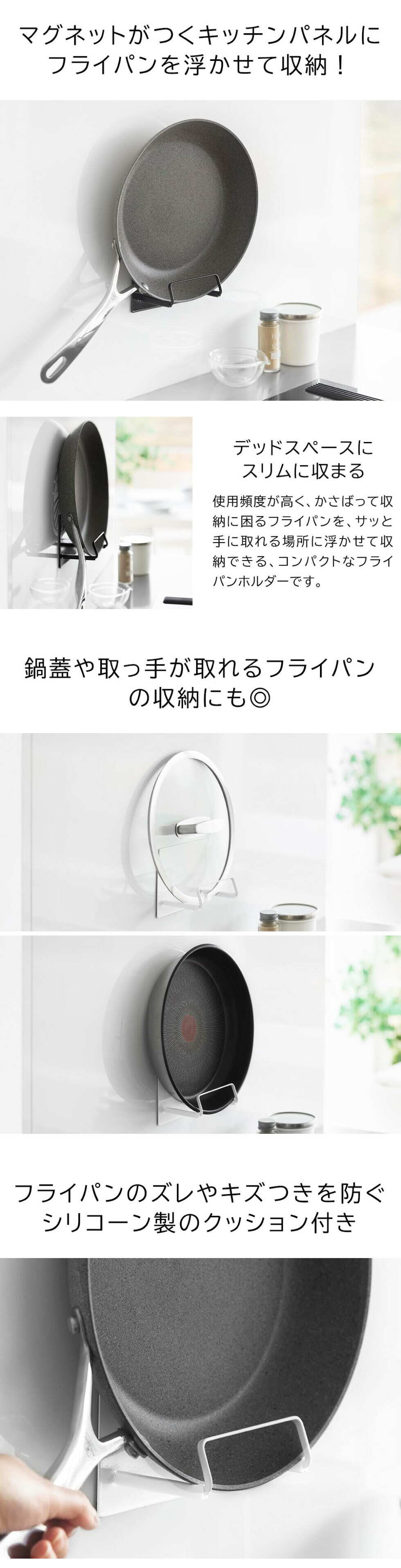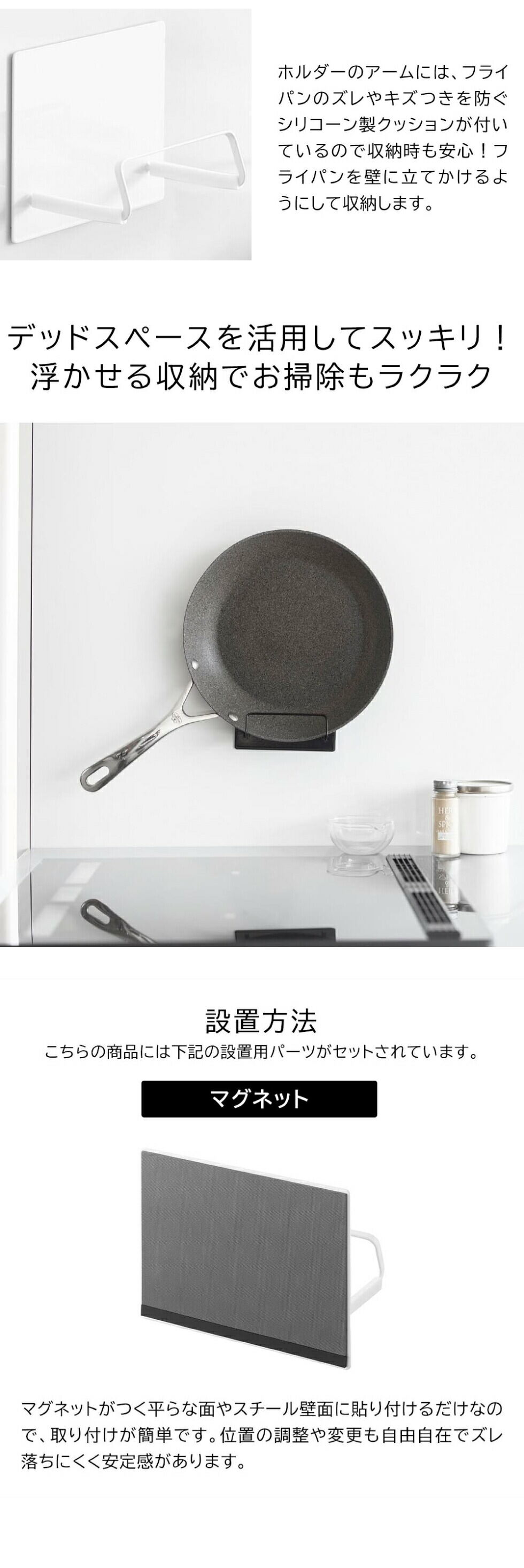 | その他詳細 1 | 耐荷重:1.5kg(静止荷重) 対応サイズ:深さ7cm以下の一般的なフライパン ※フライパンのサイズや形状によっては収納できない場合もあります。 使用できる面 マグネットがつく凹凸のない平らな面 スチール面 |